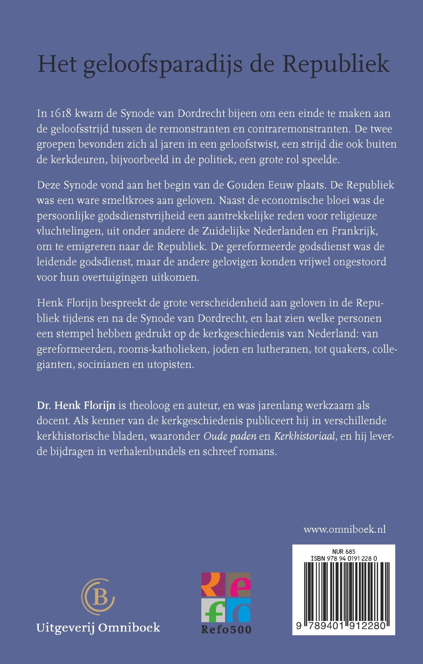 Henk Florijn toont in ‘Geloven in de Republiek’ de verscheidenheid aan geloven en het geloofsklimaat in de zeventiende eeuw in Nederland. In 1618 kwam de Synode van Dordrecht bijeen om een einde te maken aan de geloofsstrijd tussen de remonstranten en contraremonstranten. De persoonlijke godsdienstvrijheid in de Republiek was aantrekkelijk voor de geloofsgemeenschappen die elders in Europa vervolgd werden. Al snel stroomde de Republiek vol met religieuze vluchtelingen en er ontstond een smeltkroes aan geloven. Op toegankelijke wijze laat Florijn zien in ‘Geloven in de Republiek’ welke geloven en hun voormannen een stempel op de kerkgeschiedenis hebben gedrukt.