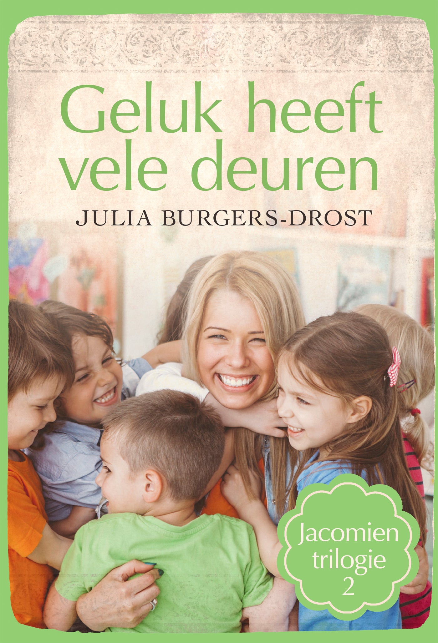 In ‘Geluk heeft vele deuren’ van Julia Burgers-Drost gaat kleuterleidster Kittie in het Huuske wonen, waar eerst Jacomien woonde. Zo gelukkig als Jacomien nu in de liefde is, ze gaat binnenkort trouwen met Jan, wil Kittie ook graag zijn. Wanneer ze Robbert, de vader van een van haar leerlingen, leert kennen, denkt ze dat hij misschien de leegte kan opvullen. Maar voelt ze zich nu echt aangetrokken tot hem of vooral tot zijn kinderen? Dan begint ze haar collega Simon opeens in een heel ander licht te zien en krijgt ze gevoelens voor hem. Als Simon haar liefde niet beantwoordt, zoekt ze Robbert weer op. Maar de liefde laat zich niet dwingen. ‘Geluk heeft vele deuren’ is het tweede deel in de Jacomien-trilogie van Julia Burgers-Drost.