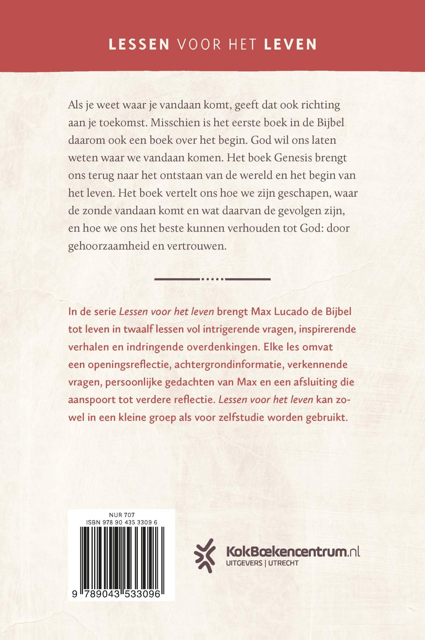 ‘Lessen voor het leven’ is een serie Bijbelstudies van Max Lucado, waarin de auteur telkens in twaalf hoofdstukken een Bijbelboek uit het Oude Testament uitdiept. Genesis neemt de lezer mee terug naar het begin, het thema ‘zonde’ – en de gevolgen daarvan – staat daarin centraal, maar ook Gods blijvende aanwezigheid. Geschikt voor zelfstandig gebruik of in groepen.