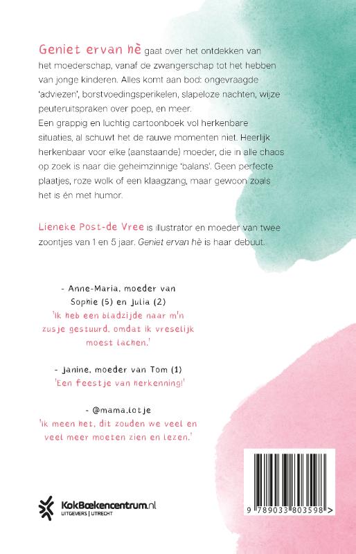 Geniet ervan hè van illustrator Lieneke Post is een luchtig boek vol levendige tekeningen over het ontdekken van het moederschap, vanaf de zwangerschap tot het hebben van jonge kinderen. Alles komt aan bod: ongevraagde ‘adviezen’, borstvoedingsperikelen, slapeloze nachten, wijze peuteruitspraken over poep, en meer. Een grappig en luchtig cartoonboek vol herkenbare situaties, al schuwt het de rauwe momenten niet. Heerlijk herkenbaar voor elke (aanstaande) moeder, die in alle chaos op zoek is naar die geheimzinnige ‘balans’. Geen perfecte plaatjes, roze wolk of een klaagzang, maar gewoon zoals het is, én met humor.