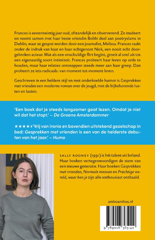 Geschreven in een heldere stijl en met onderkoelde humor is Gesprekken met vrienden een moderne roman over de jeugd, met de bijbehorende lusten en lasten. Rooney wordt gezien als de nieuwe Bret Easton Ellis, J.D. Salinger en Sylvia Plath.