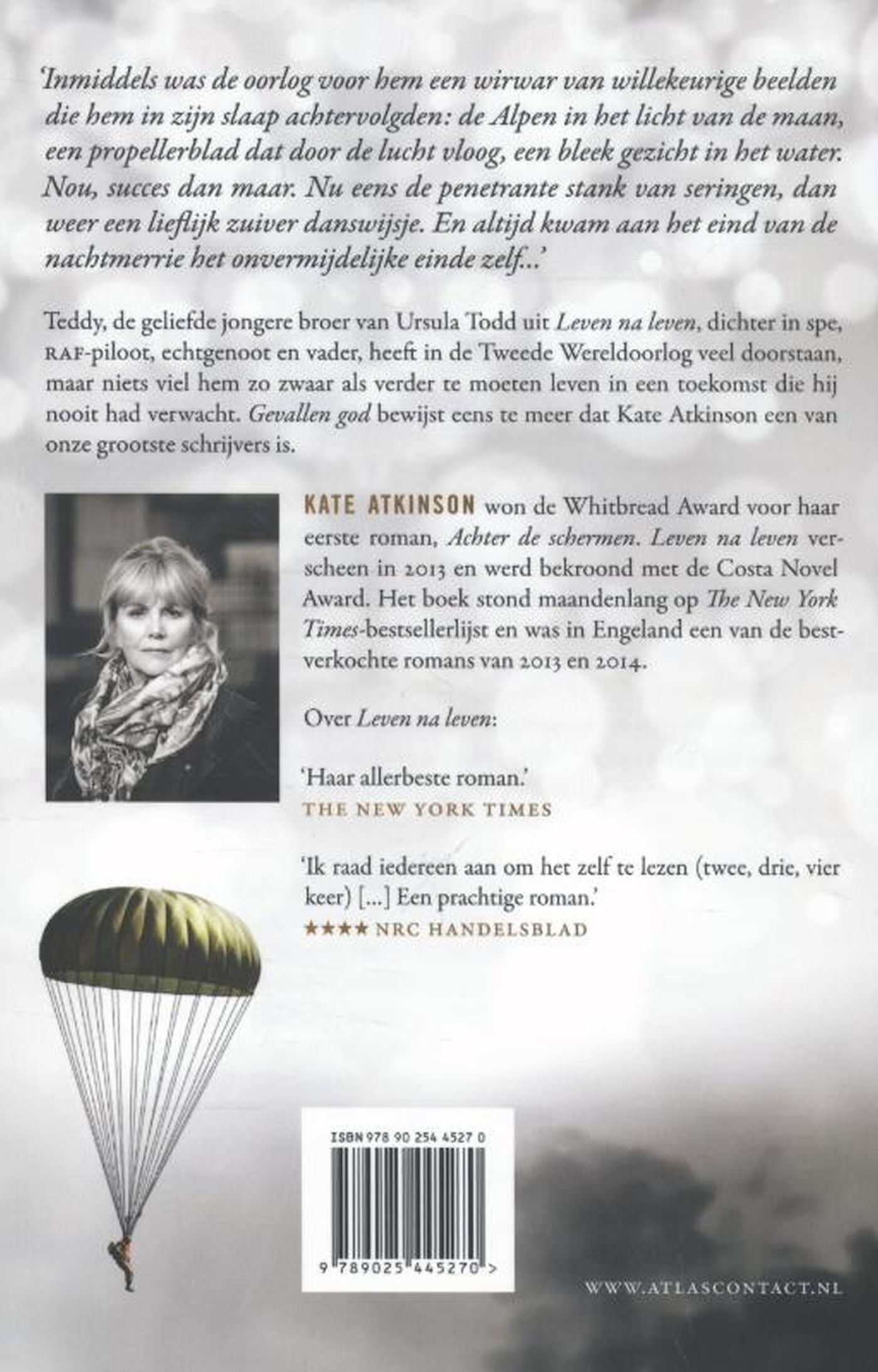Teddy, de geliefde jongere broer van Ursula Todd uit Leven na leven, dichter in spe, RAF-piloot, echtgenoot en vader, heeft in de Tweede Wereldoorlog veel doorstaan, maar niets viel hem zo zwaar als verder te moeten leven in een toekomst die hij nooit had verwacht. Gevallen god bewijst eens te meer dat Kate Atkinson een van onze grootste schrijvers is.