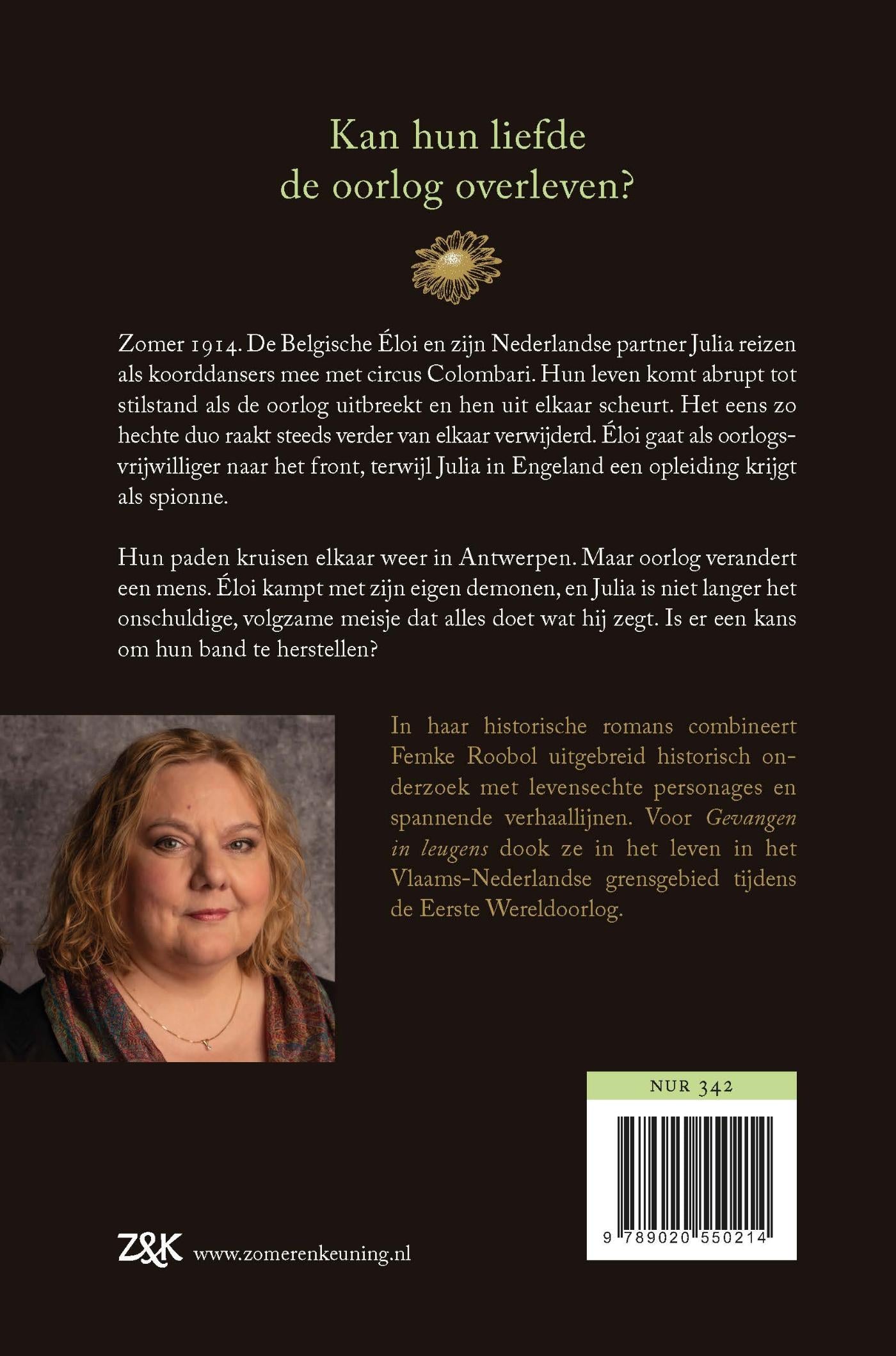 'Gevangen in leugens' van Femke Roobol speelt zich af in 1914. Éloi en Julia worden gerekruteerd door de Britse inlichtingendienst. Hun loyaliteit en de liefde voor elkaar worden op de proef gesteld als ze een Duitse officier moeten bespioneren. Er volgt een spel van kat en muis waarbij hun band onherroepelijk verandert. Is er na de oorlog nog een kans om deze te herstellen?