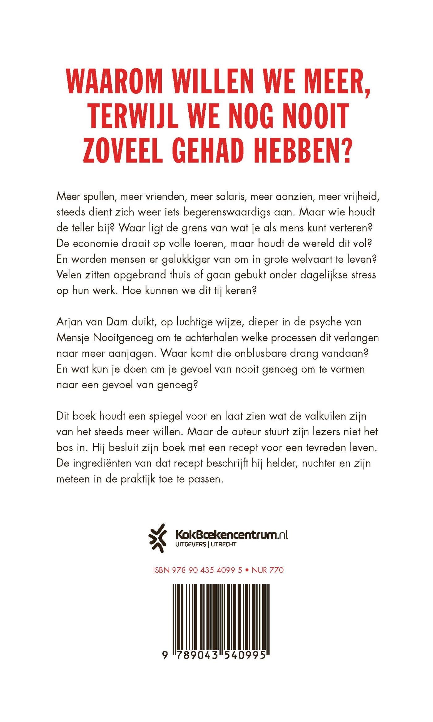 Arjan van Dam duikt, op luchtige wijze, dieper in de psyche van Mensje Nooitgenoeg om te achterhalen welke processen dit verlangen naar meer aanjagen. Waar komt die onblusbare drang vandaan? En wat kun je doen om je gevoel van nooit genoeg om te vormen naar een gevoel van genoeg?