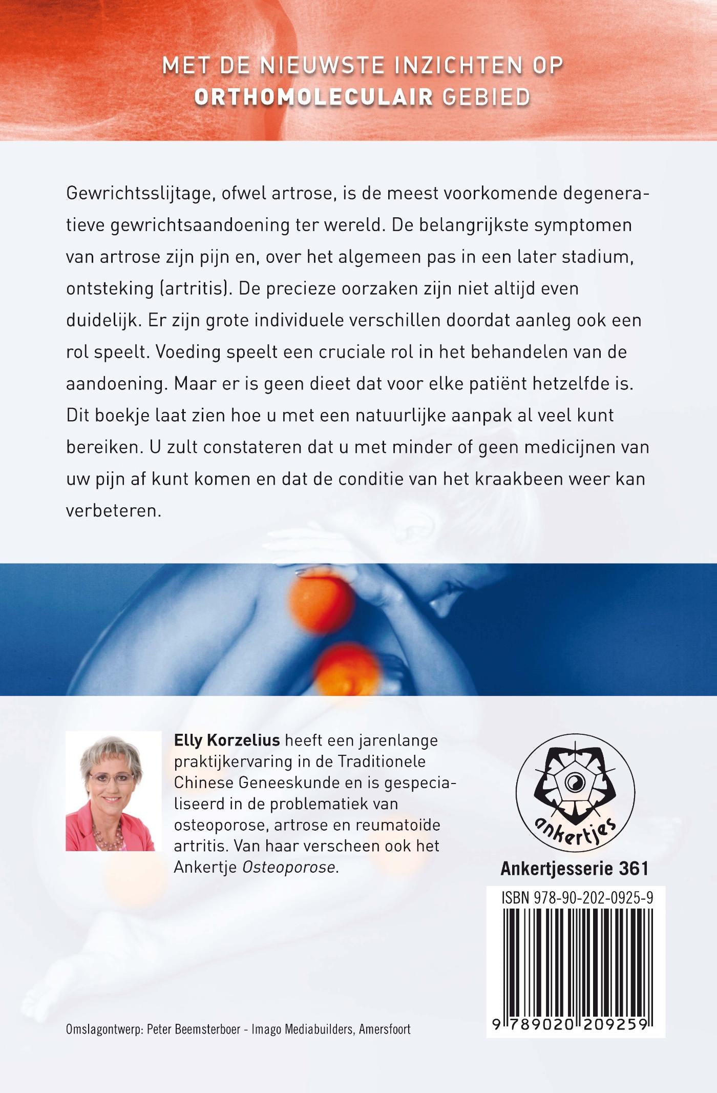 Gewrichtsslijtage, ofwel artrose, is de meest voorkomende degeneratieve gewrichtsaandoening ter wereld. De belangrijkste symptomen van artrose zijn pijn en, over het algemeen pas in een later stadium, ontsteking (artritis). De precieze oorzaken zijn niet altijd even duidelijk. Er zijn grote individuele verschillen, doordat aanleg ook een rol speelt. Voeding speelt een cruciale rol in het behandelen van de aandoening. Maar er is geen dieet dat voor elke patiënt hetzelfde is. Dit boekje laat zien hoe u met een natuurlijke aanpak al veel kunt bereiken. U zult constateren dat u met minder of geen medicijnen van uw pijn af kunt komen en de conditie van het kraakbeen weer kan verbeteren. Met de nieuwste inzichten op orthomoleculair gebied. Elly Korzelius heeft een jarenlange praktijkervaring in de Traditionele Chinese Geneeskunde en is gespecialiseerd in de problematiek van osteoporose, artrose en reumato artritis. Eerder verscheen van haar het Ankertje Osteoporose.