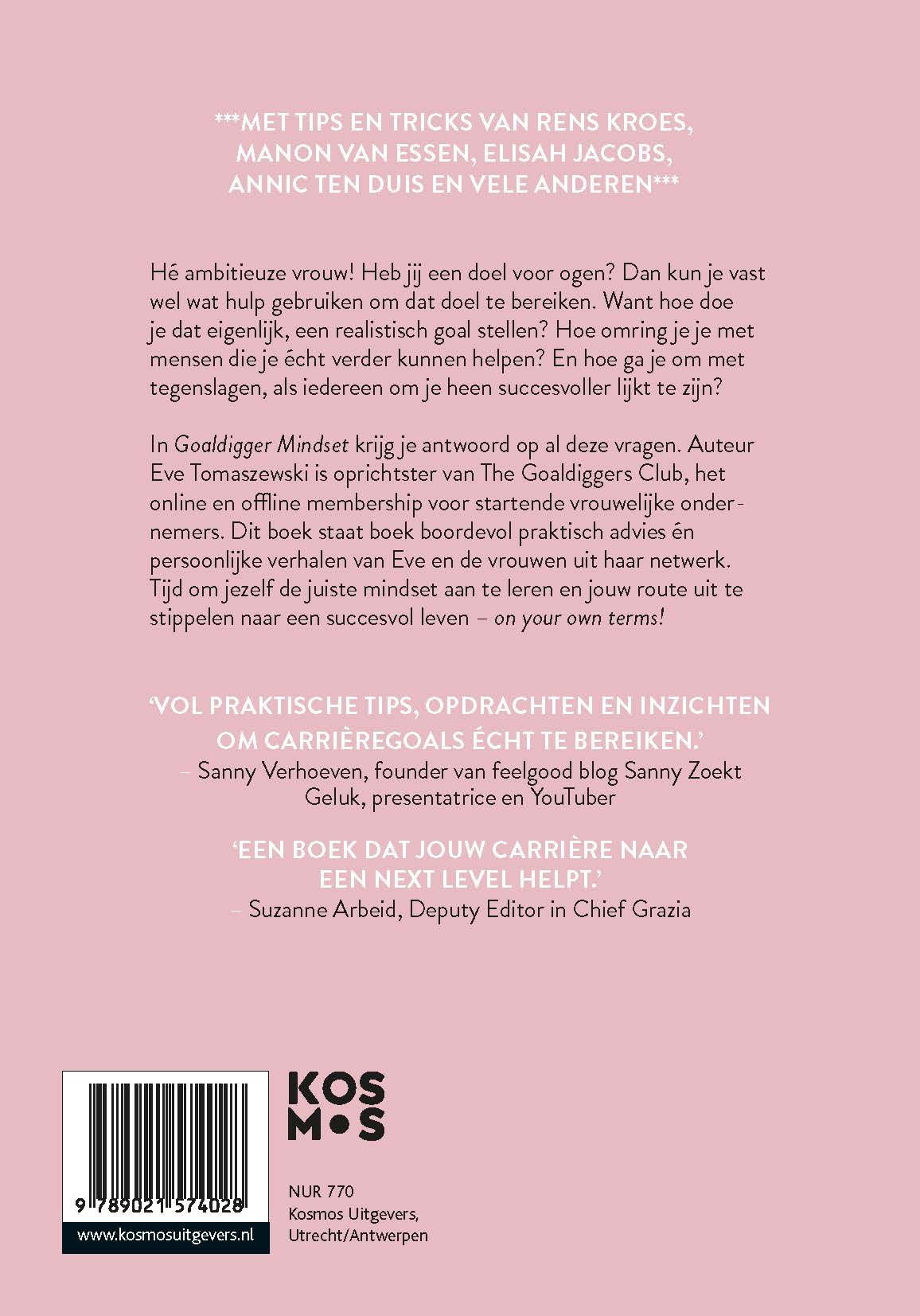 Eve Tomaszewski richtte The Goaldiggers Club op, een platform voor jonge vrouwen met ambitie. Het doel? Van elkaar leren om onze goals te bereiken! In haar boek Goaldiggers Mindset geeft Eve nu antwoorden op vragen als: hoe ga je om met tegenslagen als het lijkt of iedereen om je heen succesvoller is? Hoe combineer je een glansrijke carrière met een leven on your own terms vol vrijheid? Hoe omring je je met mensen die je écht begrijpen en verder helpen? Goaldigger Mindset staat boordevol praktisch advies en persoonlijke verhalen van Eve Tomaszewski en de vrouwen uit haar netwerk, waarmee je zelf de goede, ambitieuze mindset kunt creëren en je pad kunt uitstippelen naar een succesvol leven.