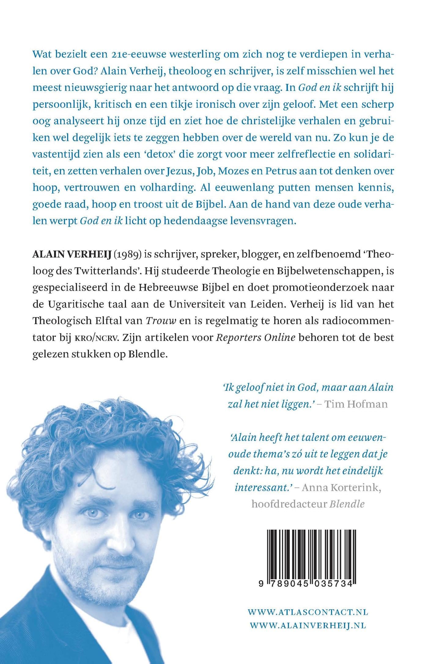 God en ik van theoloog en schrijver Alain Verheij neemt de volgende vraag als uitgangspunt: wat bezielt een 21e-eeuwse westerling om zich nog te verdiepen in verhalen over God? Verheij is zelf misschien wel het meest nieuwsgierig naar het antwoord op die vraag. In God en ik schrijft hij persoonlijk, kritisch en een tikje ironisch over zijn geloof. Met een scherp oog analyseert hij onze tijd en ziet hoe de christelijke verhalen en gebruiken wel degelijk iets te zeggen hebben over de wereld van nu. Zo kun je de vastentijd zien als een ‘detox’ die zorgt voor meer zelfreflectie en solidariteit, en zetten verhalen over Jezus, Job, Mozes en Petrus aan tot denken over hoop, vertrouwen en volharding. Al eeuwenlang putten mensen kennis, goede raad, hoop en troost uit de Bijbel. Aan de hand van deze oude verhalen werpt God en ik licht op hedendaagse levensvragen.