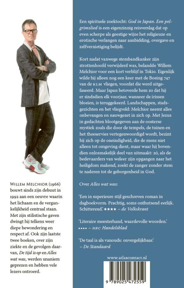 ‘God in Japan. Een pelgrimslied’ van Willem Melchior is een eigenzinnig reisverslag dat op even scherpe als geestige wijze het religieuze en erotische verlangen naar aanbidding, overgave en zelfvernietiging belijdt. Kort nadat vanwege stembandkanker zijn strottenhoofd verwijderd was, belandde Willem Melchior voor een kort verblijf in Tokio. Eigenlijk wilde hij alleen nog een keer met de Boeing 747 van de KLM vliegen, voordat die werd uit gefaseerd. Maar Japan betoverde hem zo dat hij er sindsdien elk voorjaar, wanneer de irissen bloeien, is teruggekeerd. Landschappen, stadsgezichten en het vliegveld: Melchior neemt alles onbevangen en nauwgezet in zich op. Zó, als de bedevaarders van weleer zijn opgangen naar het heiligdom makend, zoekt de zanger zonder stem te naderen tot de geborgenheid in God.