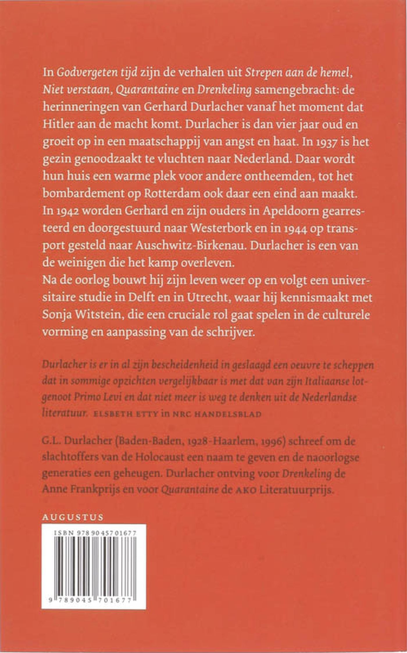 In Godvergeten tijd zijn Strepen aan de hemel, Niet verstaan, Quarantaine en Drenkeling samengebracht: de herinneringen van Gerhard Durlacher vanaf het moment dat Hitler aan de macht komt. Durlacher is dan vier jaar oud en groeit op in een maatschappij van angst en haat. In 1937 is het gezin genoodzaakt te vluchten naar Nederland. Daar wordt hun huis een warme plek voor andere ontheemden, tot het bombardement ook daar een eind aan maakt. In 1942 worden Gerhard en zijn ouders in Apeldoorn gearresteerd en doorgestuurd naar Westerbork en in 1944 worden ze op transport gesteld naar Auschwitz-Birkenau. Durlacher is een van de weinigen die het kamp overleven. Na de oorlog bouwt hij zijn leven weer op en volgt een universitaire studie in Delft en in Utrecht, waar hij kennismaakt met Sonja Witstein, die een cruciale rol gaat spelen in de culturele vorming en aanpassing van de schrijver.