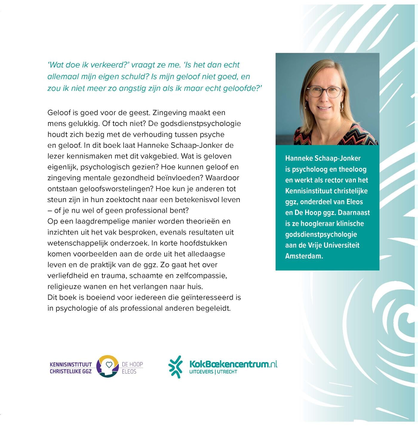 In Goed voor de geest laat psycholoog en theoloog Hanneke Schaap-Jonker je kennismaken met haar vakgebied: de klinische godsdienstpsychologie. Ze schept hierin duidelijkheid over de verhouding tussen onze psyche en ons geloof. Zo gaat ze onder andere in op de vraag of geloven goed is voor de geest. Ook neemt ze allerlei misverstanden op dit gebied onder de loep. Een boek dat veel aanreikt over ons denken en ons geloven en dat mensen toerust die anderen geestelijk begeleiden, zoals pastoraal werkers.