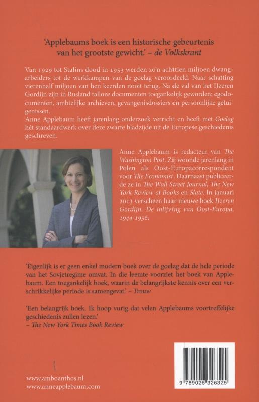 Van 1929 tot Stalins dood in 1953 werden zon achttien miljoen dwangarbeiders tot de werkkampen van de Goelag veroordeeld. Naar schatting vierenhalf miljoen van hen keerden nooit terug. Na de val van het IJzeren Gordijn zijn in Rusland talloze documenten toegankelijk geworden: egodocumenten, ambtelijke archieven, gevangenisdossiers, persoonlijke getuigenissen. Applebaum heeft jarenlang onderzoek verricht en heeft met Goelag hét standaardwerk over deze zwarte bladzijde uit de Europese geschiedenis geschreven.