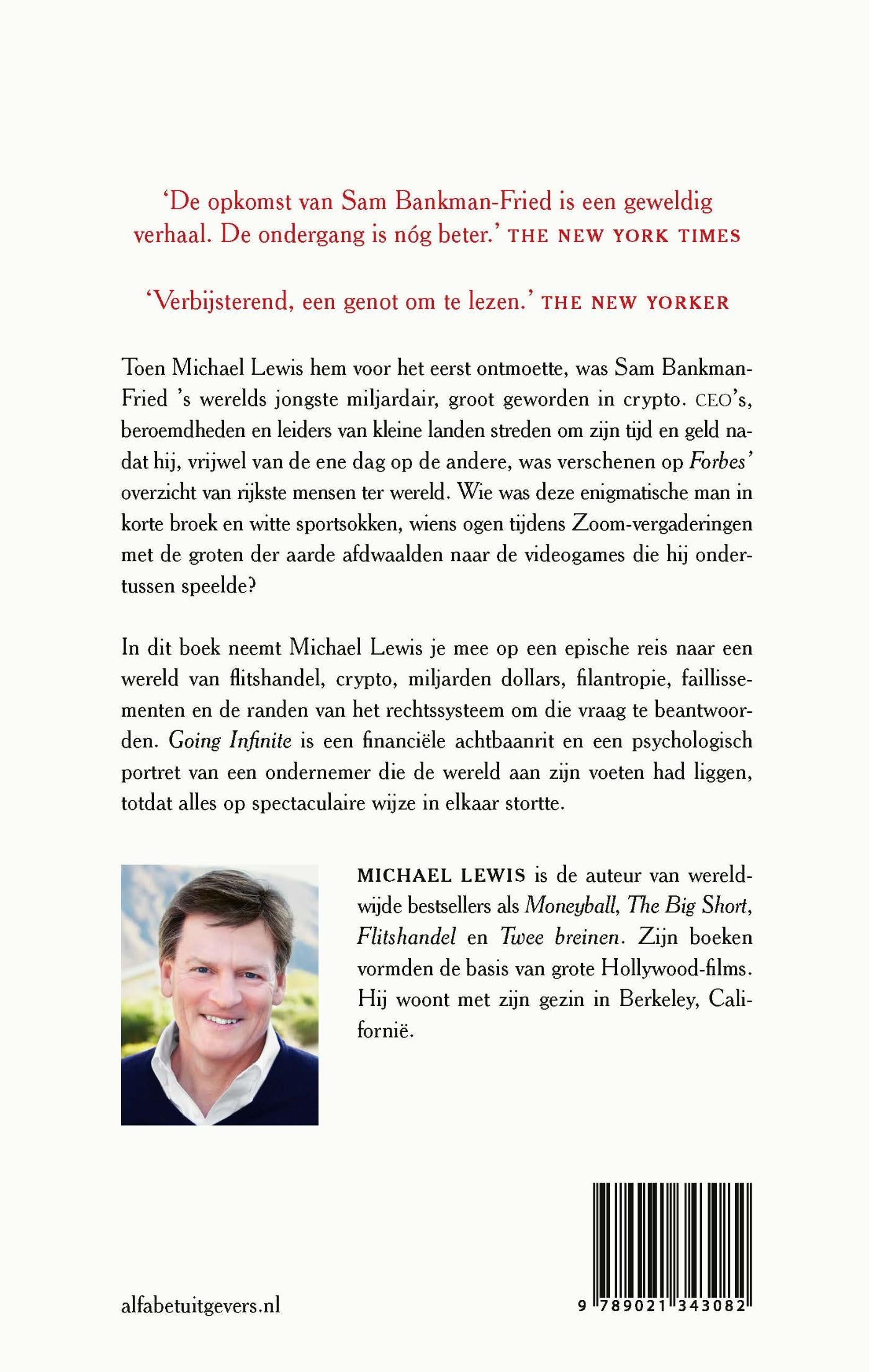 Toen Michael Lewis hem voor het eerst ontmoette, was Sam Bankman-Fried ’s werelds jongste miljardair, groot geworden in crypto. CEO’s, beroemdheden en machthebbers streden om zijn tijd en geld nadat hij, vrijwel van de ene dag op de andere, was verschenen op ‘Forbes’’ lijst van rijkste mensen ter wereld. Wie was deze enigmatische man in korte broek en witte sokken, wiens ogen tijdens Zoom-vergaderingen afdwaalden naar de videogames die hij ondertussen speelde? In ‘Going Infinite’ probeert Michael Lewis die vraag te beantwoorden. Hij neemt lezers mee op een epische reis naar een universum van flitshandel, crypto, miljarden dollars, filantropie, faillissementen en de grenzen van het rechts systeem. Dit onweerstaanbare boek is een achtbaanrit door de financiële wereld en een psychologisch portret van een ondernemer die de wereld aan zijn voeten had liggen, totdat alles op ongekende wijze in elkaar stortte.