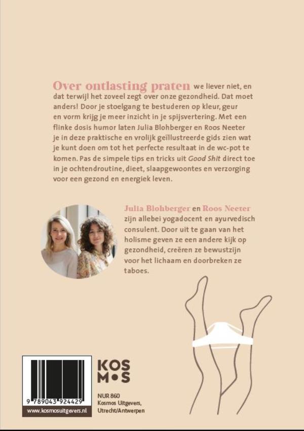 We praten liever niet over onze ontlasting, en dat terwijl het zoveel zegt over onze gezondheid! Deze gids voor een goede spijsvertering, inclusief tracker voor je stoelgang, leert je kijken naar wat je teruggeeft aan de natuur en daar lessen in te vinden. Door de regelmaat, vorm, geur en kleur van je ontlasting bij te houden en te analyseren krijg je inzicht in je darmen en de staat van je spijsvertering. Met een flinke dosis humor laten Roos Neeter en Julia Blohberger zien wat je kunt doen om tot het perfecte resultaat in de wc-pot te komen, waardoor je gezonder en energieker door het leven zult gaan. Good Shit is taboedoorbrekend, vrolijk, informatief en nuttig.