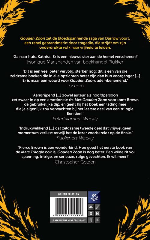 'Pierce Brown is een wonderkind. Hoe goed het eerste boek van de Mars Trilogie ook is, Gouden Zoon is nog beter. Een wilde rit vol spanning, intrige, en serieuze, ruige gevechten. Ik wil meer! ' Christopher Golden, auteur van Tinnen soldaten en Sneeuwblind