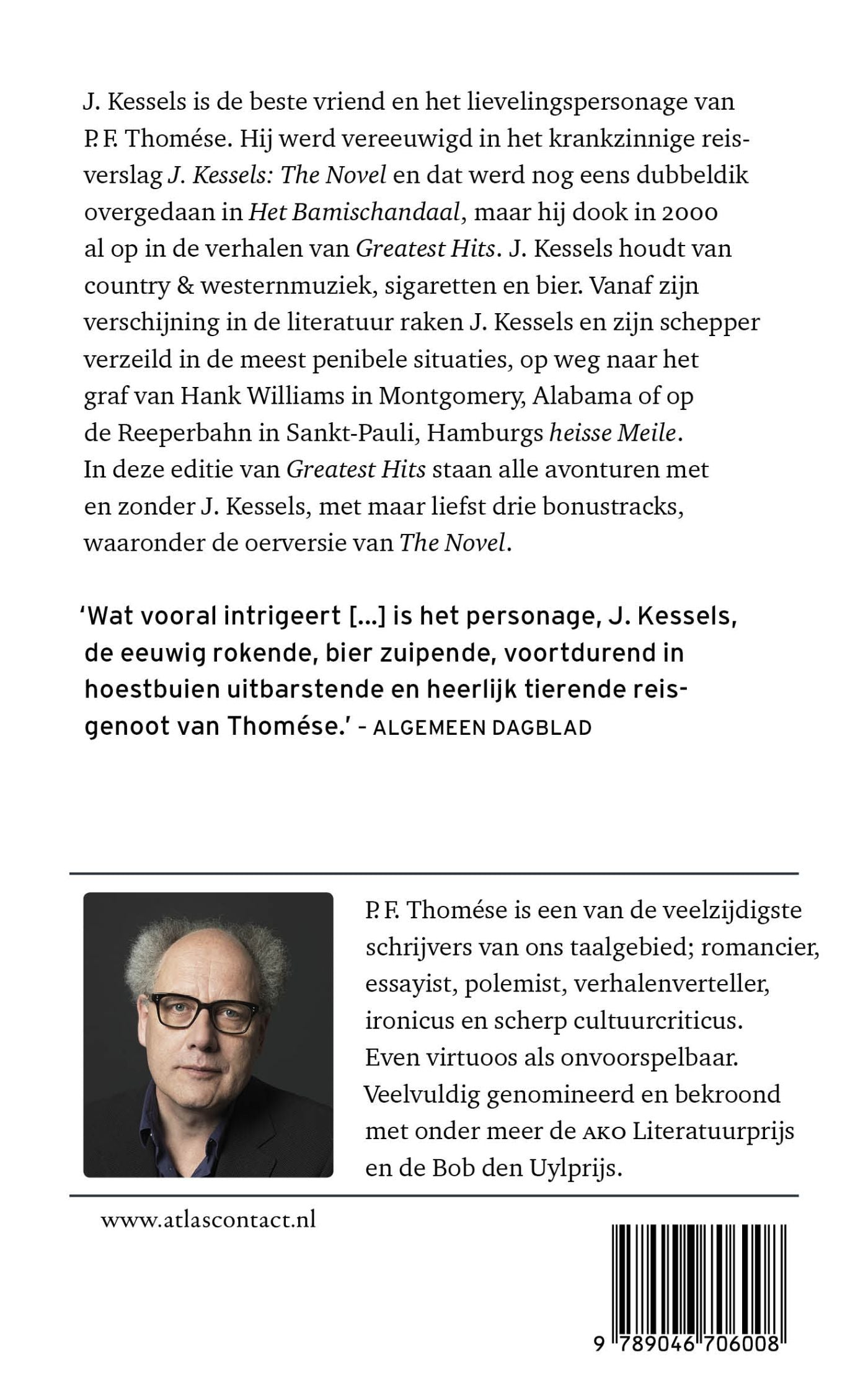 In ‘Greatest Hits’ is J. Kessels de beste vriend en het lievelingspersonage van P.F. Thomése. Hij werd vereeuwigd in het krankzinnige reisverslag J. Kessels: ‘The Novel’ en dat werd nog eens dubbeldik overgedaan in ‘Het Bamischandaal’, maar hij dook in 2000 al op in de verhalen van ‘Greatest Hits’. J. Kessels houdt van country & westernmuziek, sigaretten en bier. Vanaf zijn verschijning in de literatuur raken J. Kessels en zijn schepper verzeild in de meest penibele situaties, op weg naar het graf van Hank Williams in Montgomery, Alabama of op de Reeperbahn in Sankt-Pauli, Hamburgs heisse Meile. In deze editie van ‘Greatest Hits’ staan alle avonturen met en zonder J. Kessels, met maar liefst drie bonustracks, waaronder de oerversie van ‘The Novel’.