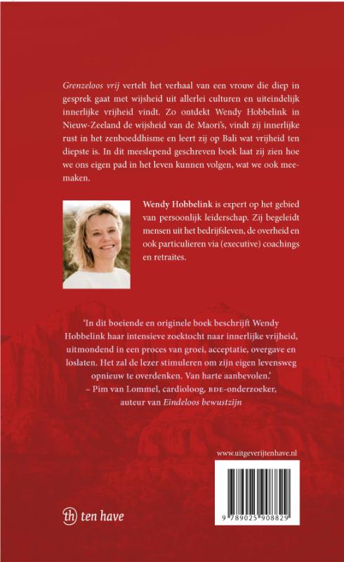 ‘Grenzeloos vrij’ vertelt het verhaal van een vrouw die diep in gesprek gaat met wijsheid uit allerlei culturen en uiteindelijk innerlijke vrijheid vindt. Zo ontdekte Wendy Hobbelink in Nieuw-Zeeland de wijsheid van de Maori’s, vond zij innerlijke rust in het zenboeddhisme en leerde zij op Bali wat vrijheid ten diepste is. Dit meeslepend geschreven boek is van belang voor iedereen die zich wel eens afvraagt of hij of zij eigenlijk wel de juiste weg in het leven bewandelt.