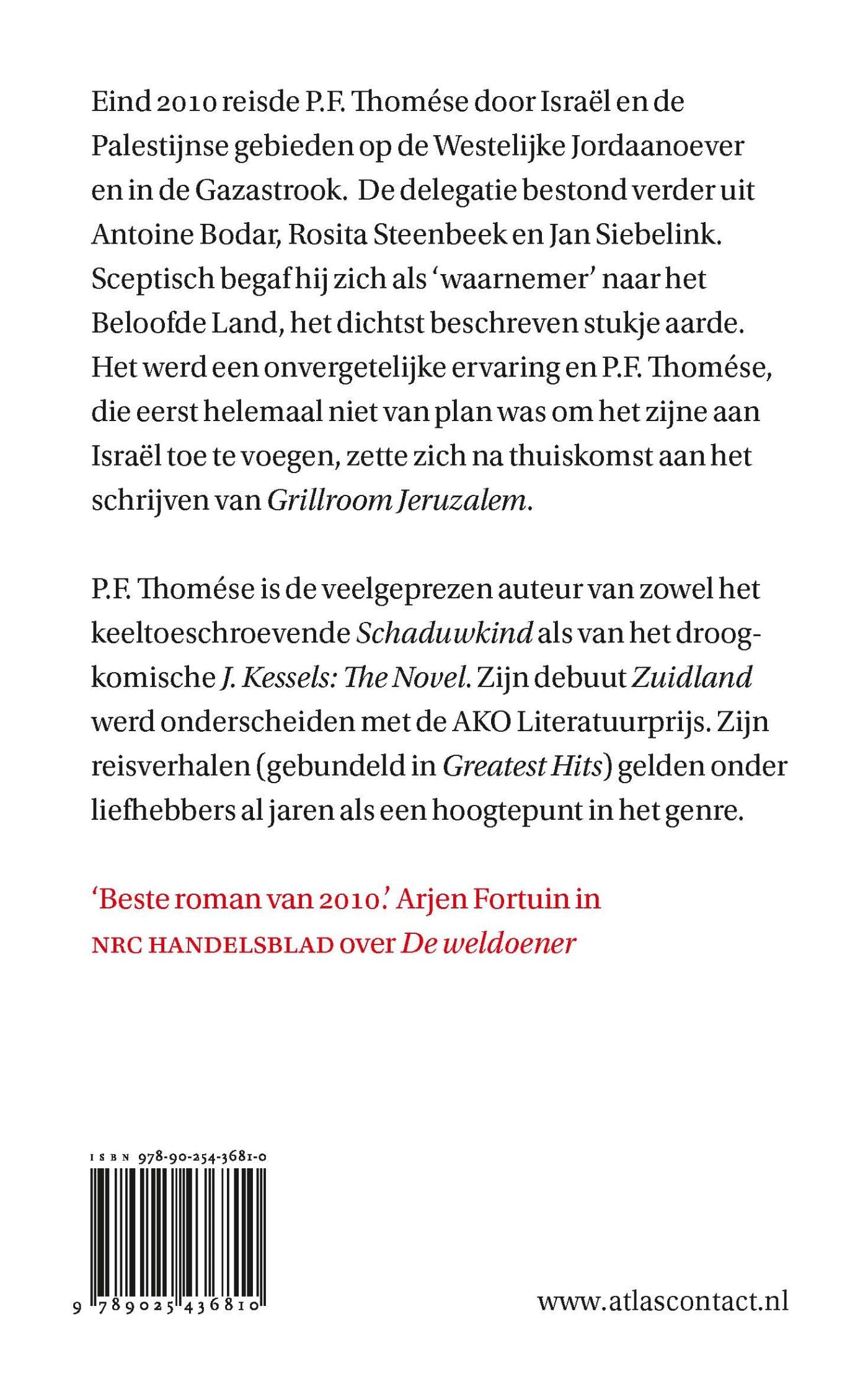 P.F. Thomése reisde als lid van een schrijversdelegatie door Israël en de bezette gebieden, met name de Westelijke Jordaanoever en de Gazastrook. Sceptisch begaf hij zich naar het Beloofde Land, het dichtst beschreven stukje aarde. Het werd een onvergetelijke ervaring, en Thomése, die eigenlijk helemaal niet van plan was geweest om het zijne aan Israël toe te voegen, zette zich na thuiskomst meteen aan het schrijven van 'Grillroom Jeruzalem'.