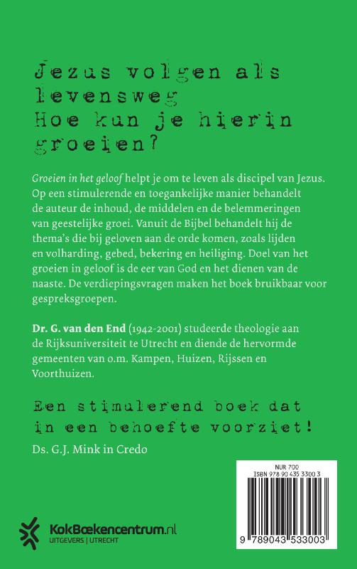 Groeien in het geloof van G. van den End is een handreiking voor het leven als discipel van Jezus. Op een stimulerende en toegankelijke manier behandelt Van den End de inhoud, de middelen en de belemmeringen van geestelijke groei. Vanuit de Bijbel behandelt hij de thema’s die bij geloven aan de orde komen, zoals lijden en volharding, gebed, bekering en heiliging. Doel van het groeien in geloof is de eer van God en het dienen van de naaste. De verdiepingsvragen maken het boek bruikbaar voor gespreksgroepen.
