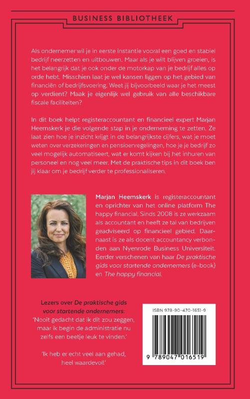 In ‘Groeien met je bedrijf’ helpt registeraccountant en financieel expert Marjan Heemskerk je de volgende stap in je onderneming te zetten. Als ondernemer wil je in eerste instantie vooral een goed en stabiel bedrijf neerzetten en uitbouwen. Maar als je wilt blijven groeien, is het belangrijk dat je ook onder de motorkap van je bedrijf alles op orde hebt. Misschien laat je wel kansen liggen op het gebied van financiën of bedrijfsvoering. Weet jij bijvoorbeeld waar je het meest op verdient? Maak je eigenlijk wel gebruik van alle beschikbare fiscale faciliteiten? Heemskerk laat zien hoe je inzicht krijgt in de belangrijkste cijfers, wat je moet weten over verzekeringen en pensioenregelingen, hoe je je bedrijf zo veel mogelijk automatiseert, wat er komt kijken bij het inhuren van personeel en nog veel meer. Met de praktische tips in dit boek ben jij klaar om je bedrijf verder te professionaliseren.