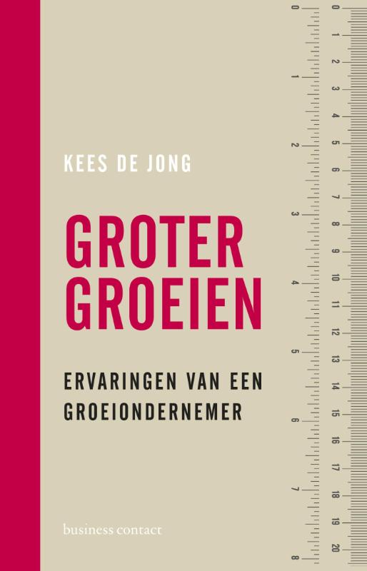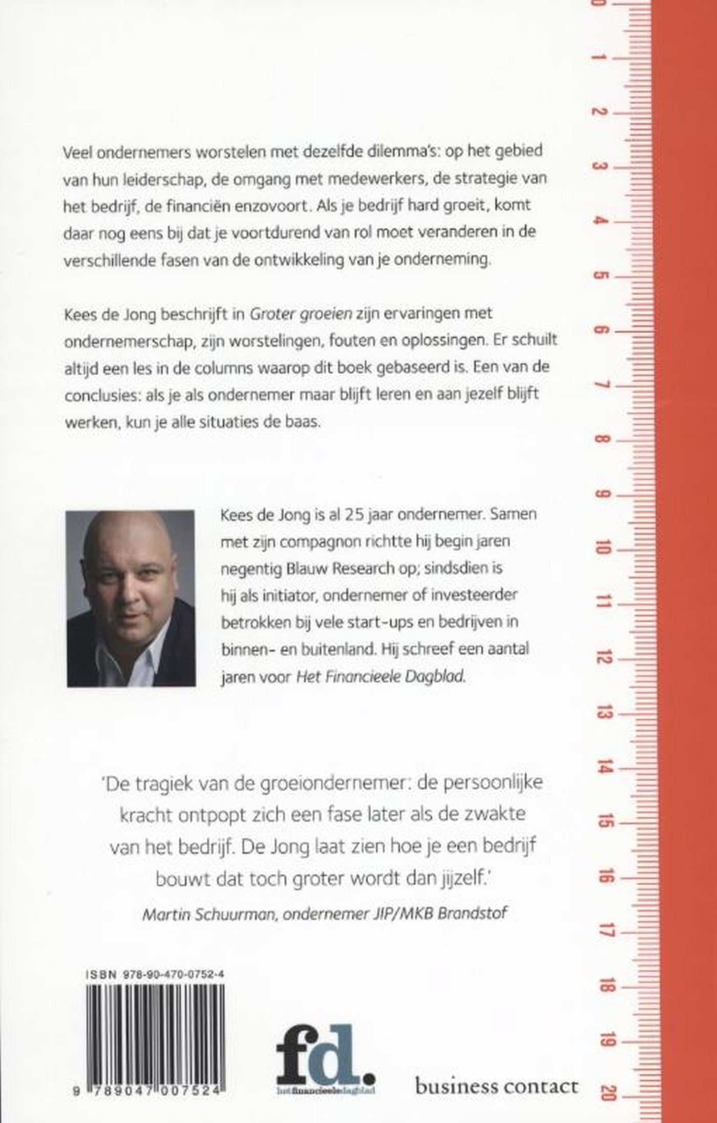 Kees de Jong beschrijft in Groter groeien zijn ervaringen met ondernemerschap, zijn worstelingen, fouten en oplossingen. Er schuilt altijd een les in de columns waarop dit boek gebaseerd is. Een van de conclusies: als je als ondernemer maar blijft leren en aan jezelf blijft werken, kun je alle situaties de baas.