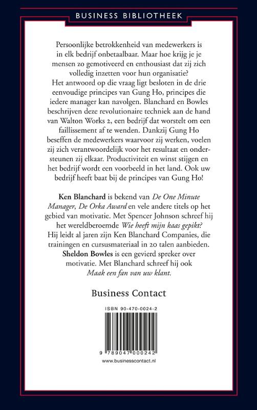 Hoe krijg je je mensen zo gemotiveerd en enthousiast dat zij zich volledig inzetten voor hun organisatie? In ‘Gung Ho’ beschrijven Ken Blanchard en Sheldon Bowles een revolutionaire techniek om persoonlijke betrokkenheid van medewerkers te vergroten. Het antwoord ligt besloten in de drie eenvoudige principes van ‘Gung Ho’, principes die voor elke manager zijn na te volgen. Blanchard en Bowles beschrijven deze aan de hand van een bedrijf dat worstelt om een faillissement af te wenden. Dankzij ‘Gung Ho’ weten medewerkers waarvoor zij werken, voelen zij zich verantwoordelijk en ondersteunen zij elkaar. Productiviteit en winst stijgen en het bedrijf wordt een voorbeeld in het land. Ook uw bedrijf heeft baat bij de principes van ‘Gung Ho’!