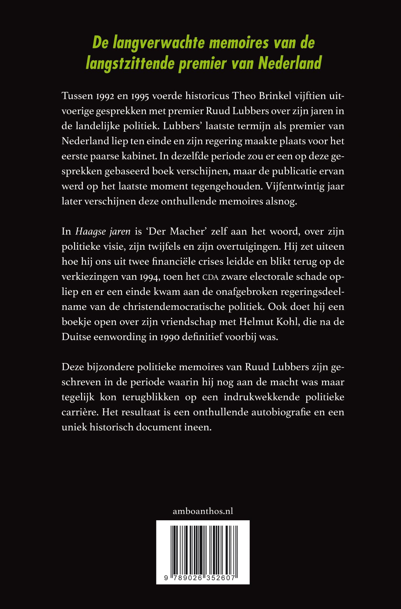 In Haagse jaren is ‘Der Macher’ zelf aan het woord, over zijn politieke visie, zijn twijfels en zijn overtuigingen. Hij zet uiteen hoe hij ons uit twee financiële crises leidde en blikt terug op de verkiezingen van 1994, toen het CDA zware electorale schade opliep en er een einde kwam aan de onafgebroken regeringsdeelname van de christelijke politiek. Ook doet hij een boekje open over zijn vriendschap met Helmut Kohl, die na de Duitse eenwording in 1990 definitief voorbij was.
