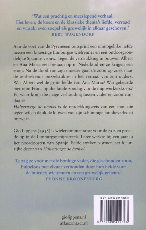 'Halverwege de heuvel' van Gio Lippens gaat over de onmogelijke liefde tussen een knoestige Limburgse wielrenner en een ondoorgrondelijke Spaanse vrouw. Aan de voet van de Pyreneeën ontspruit de relatie tussen Albert en Ana Maria. Tegen de verdrukking in bouwen ze een bestaan op in Nederland. Na de dood van zijn moeder gaat hun zoon op zoek naar de ontbrekende puzzelstukjes in het verhaal van zijn ouders. Was Albert wel de grote liefde van Ana Maria? Wat gebeurde er met oom Frans op die fatale zondag van de mijnwerkerskoers? En waar komt die ijzige verhouding tussen vader en zoon vandaan? 'Halverwege de heuvel' beschrijft de ontdekkingsreis van een man die tegen wil en dank de kluwen van zijn schimmige familieverleden ontwart.