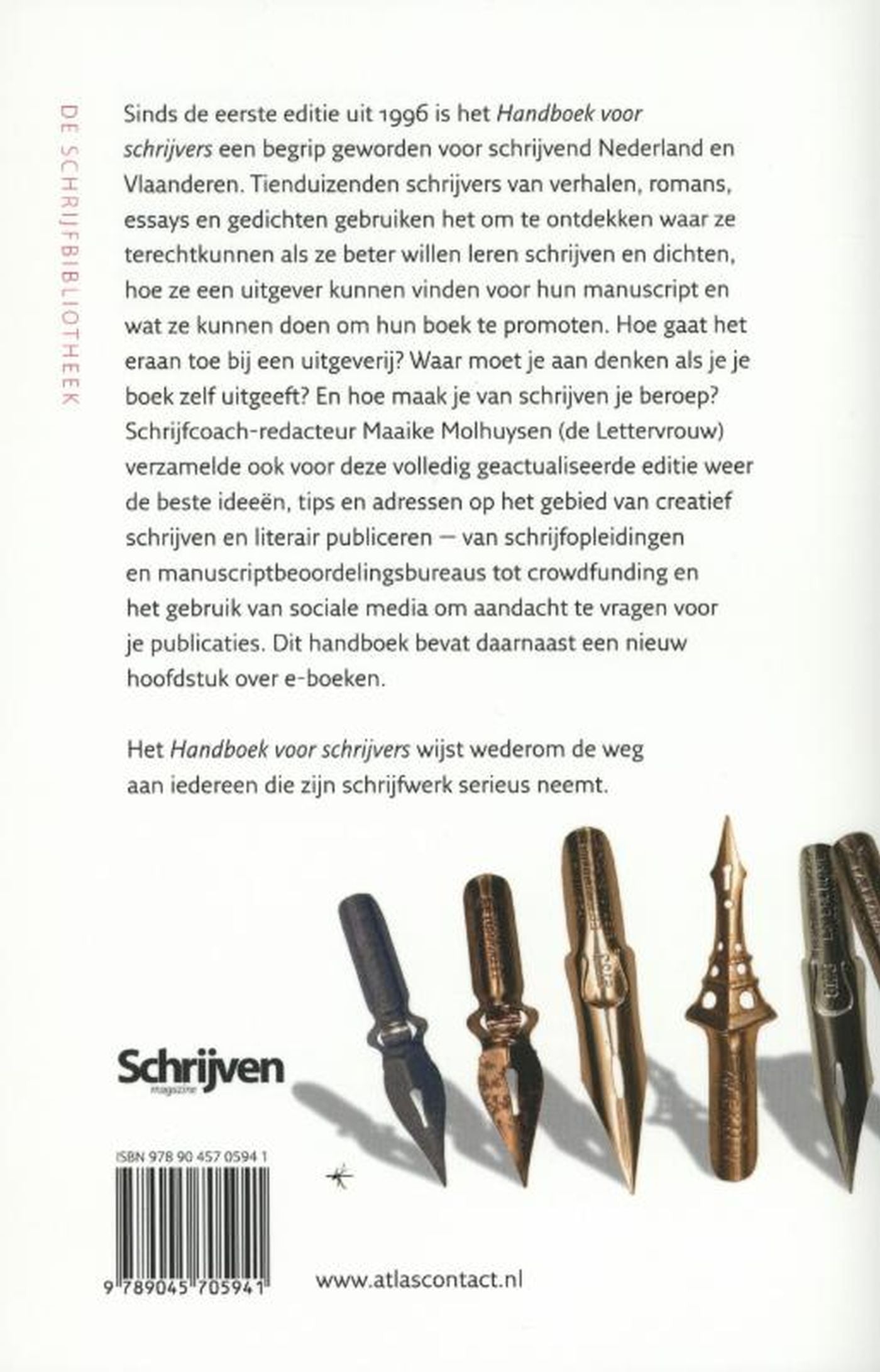 Sinds de eerste editie uit 1996 is het Handboek voor schrijvers een begrip geworden voor schrijvend Nederland en Vlaanderen. Tienduizenden schrijvers van verhalen, romans, essays en gedichten gebruiken het om te ontdekken waar ze terechtkunnen als ze beter willen leren schrijven en dichten, hoe ze een uitgever kunnen vinden voor hun manuscript en wat ze kunnen doen om hun boek te promoten. Hoe gaat het eraan toe bij een uitgeverij? Waar moet je aan denken als je je boek zelf uitgeeft? En hoe maak je van schrijven je beroep? Schrijfcoach-redacteur Maaike Molhuysen (de Lettervrouw) verzamelde ook voor deze volledig geactualiseerde editie weer de beste ideeën, tips en adressen op het gebied van creatief schrijven en literair publiceren van schrijfopleidingen en manuscriptbeoordelingsbureaus tot crowdfunding en het gebruik van sociale media om aandacht te vragen voor je publicaties. Dit handboek bevat daarnaast een nieuw hoofdstuk over e-boeken.
