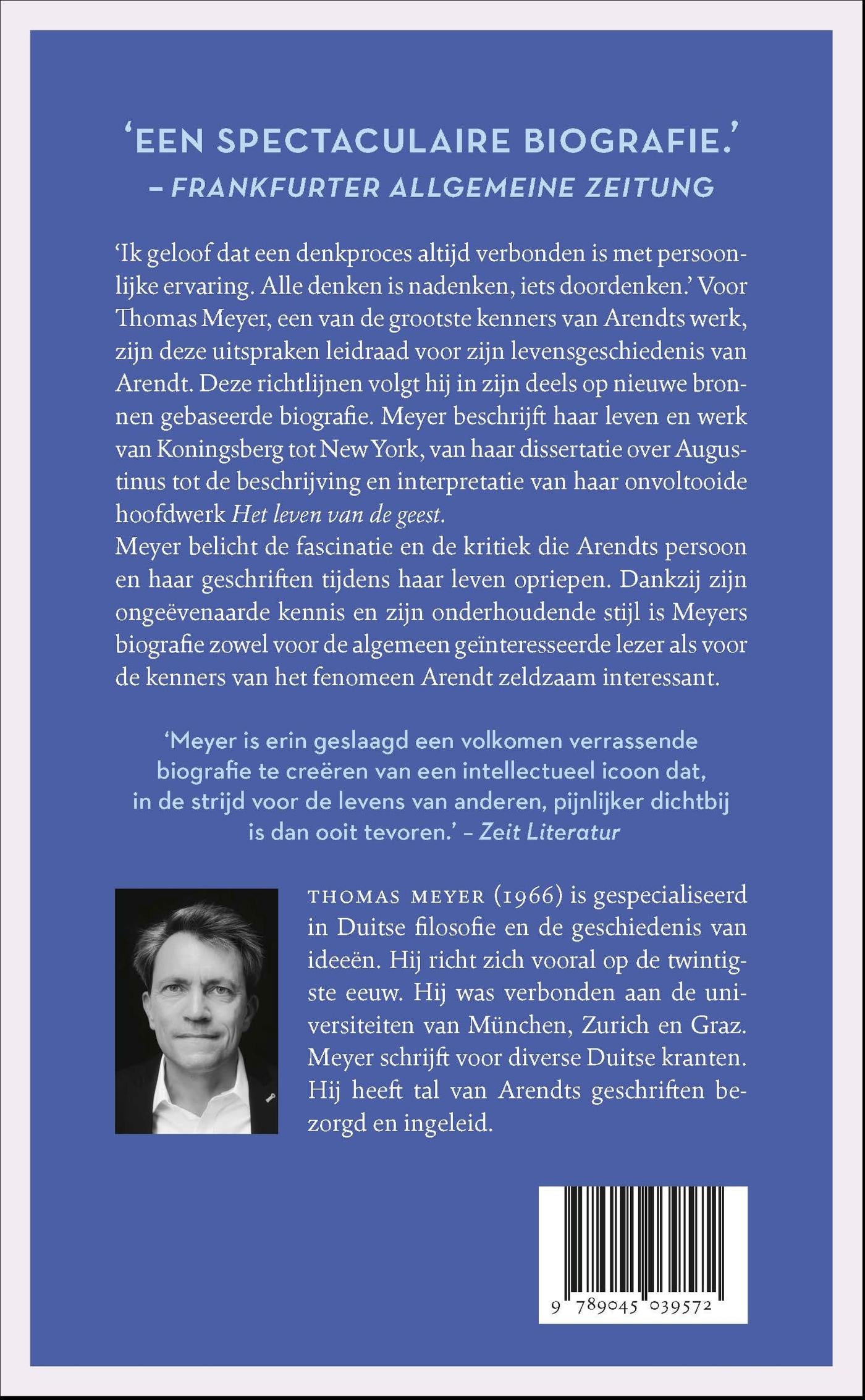 'Ik geloof dat een denkproces altijd verbonden is met persoonlijke ervaring. Alle denken is nadenken, iets doordenken.' Voor Thomas Meyer, een van de grootste kenners van Arendts werk, zijn deze uitspraken leidraad voor zijn levensgeschiedenis van Arendt. Deze richtlijnen volgt hij in zijn deels op nieuwe bronnen gebaseerde biografie. Meyer beschrijft haar leven en werk van Koningsberg tot New York, van haar dissertatie over Augustinus tot de beschrijving en interpretatie van haar onvoltooide hoofdwerk Het leven van de geest.