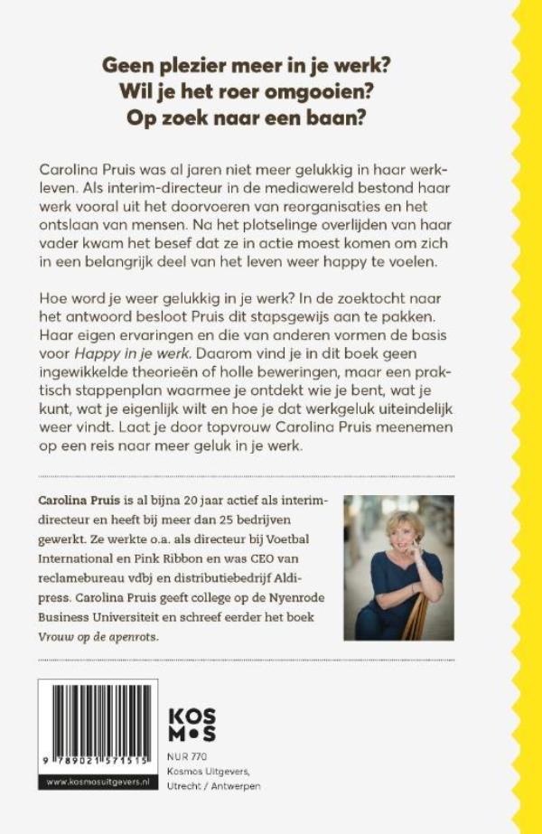 Topvrouw Carolina Pruis weet als geen ander hoe belangrijk het is om happy in je werk te zijn. Geen plezier meer in je werk? Wil je het roer omgooien? Je baan kwijtgeraakt? Stapsgewijs en op basis van psychologische inzichten, eigen ervaringen en persoonlijke verhalen van anderen, helpt Pruis je een nieuwe draai aan je carrière te geven. Geen ingewikkelde theorieën of holle beweringen, maar een praktisch stappenplan waarmee je ontdekt wie je bent, wat je kunt, wat je eigenlijk wilt en hoe je dat werkgeluk uiteindelijk vindt.