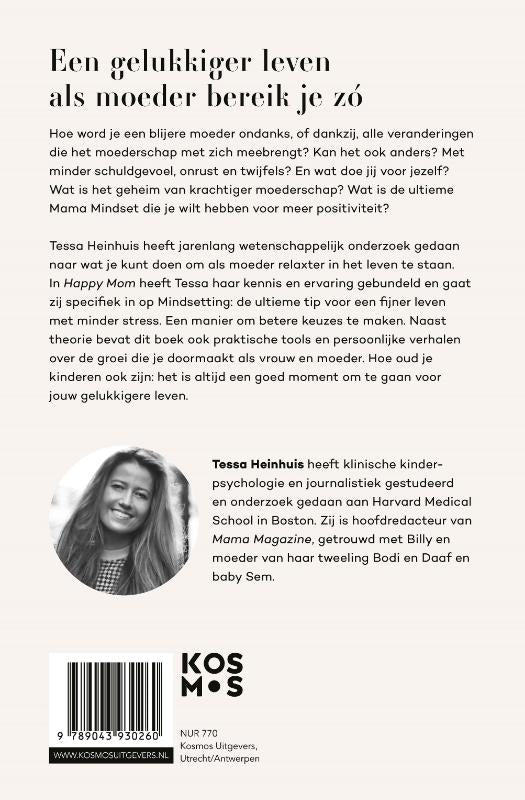 In 'Happy Mom' onthult Tessa Heinhuis het geheim van de gelukkige mama mindset. In dit boek laat ze jou zien hoe je door het veranderen van je mindset een gelukkige moeder wordt, ondanks (of zelfs dankzij) alle veranderingen die het moederschap met zich meebrengt. Wat maakt een moeder van jonge, opgroeiende kinderen gelukkiger?