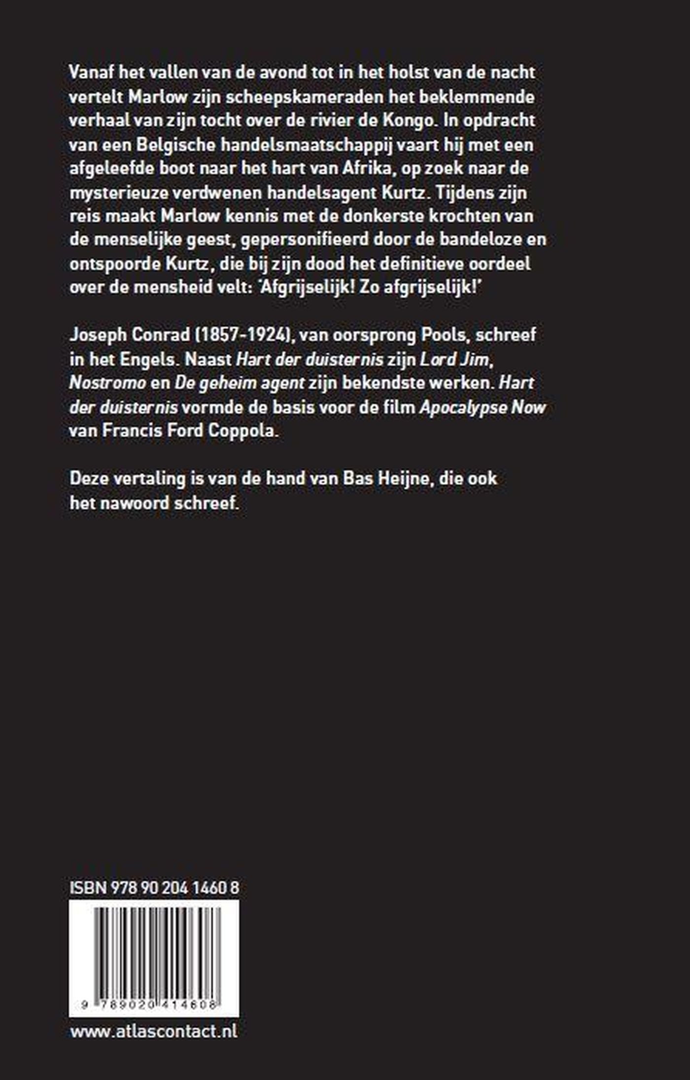Vanaf het vallen van de avond tot in het holst van de nacht vertelt Marlow zijn scheepskameraden het beklemmende verhaal van zijn tocht over de rivier de Kongo. In opdracht van een Belgische handelsmaatschappij vaart hij met een afgeleefde boot naar het hart van Afrika, op zoek naar de mysterieuze verdwenen handelsagent Kurtz. Tijdens zijn reis maakt Marlow kennis met de donkerste krochten van de menselijke geest, gepersonifieerd door de bandeloze en ontspoorde Kurtz, die bij zijn dood het definitieve oordeel over de mensheid velt: ‘Afgrijselijk! Zo afgrijselijk!’