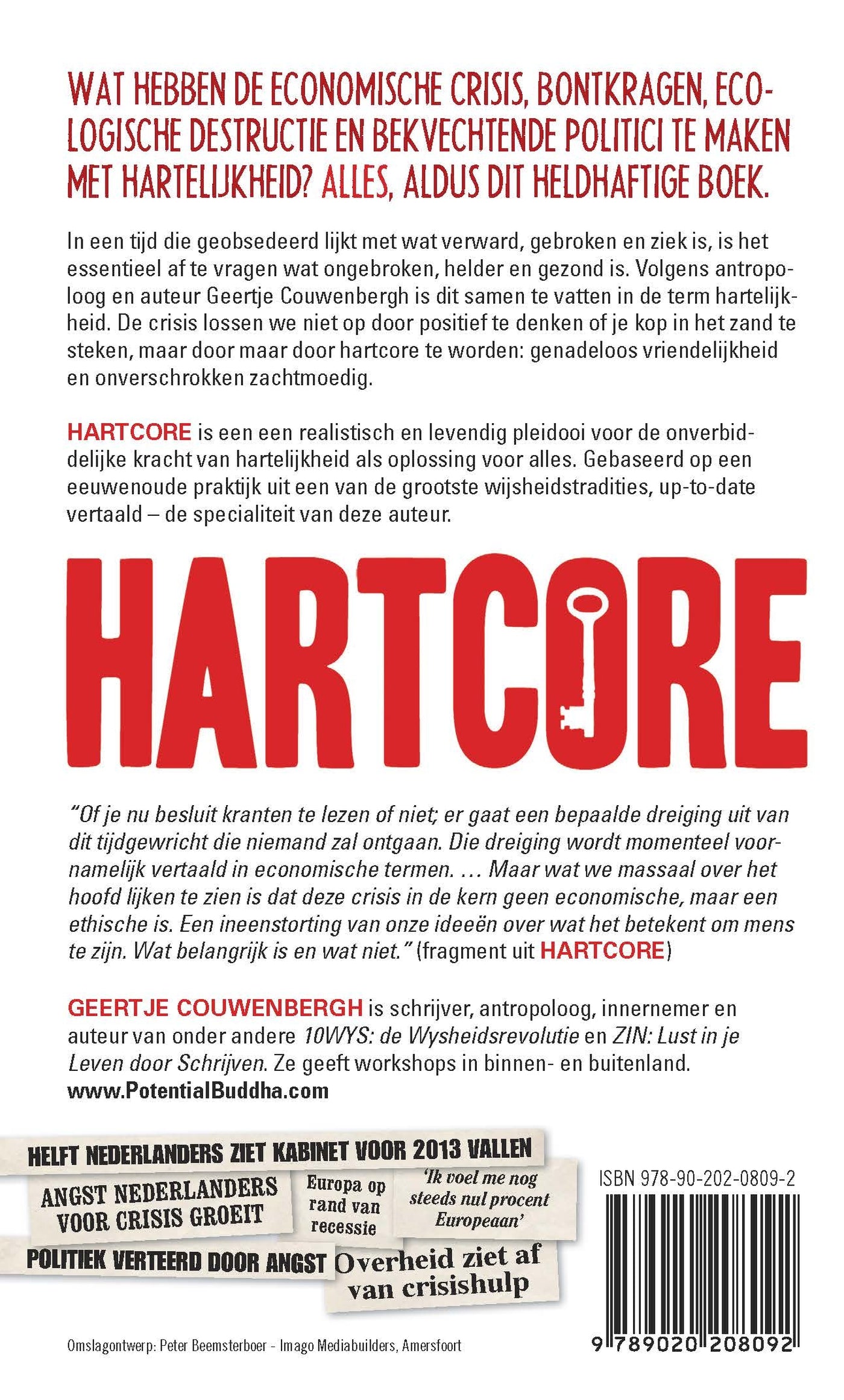 Wat hebben de economische crisis, destructie van ecosystemen, politieke en religieuze fundamentalisering en het dreigende failliet van Europa te maken met hartelijkheid? Alles. Wanneer de fundamenten van een cultuur schudden is het de kunst ons te beroepen op de fundamenten van menselijkheid zelf.Volgens Geertje Couwenbergh is dit samen te vatten in de kwaliteit van hartelijkheid. HARTCORE is een een non-New Agey, realistisch en levendig pleidooi voor de onverbiddelijke kracht van hartelijkheid als oplossing voor alles.