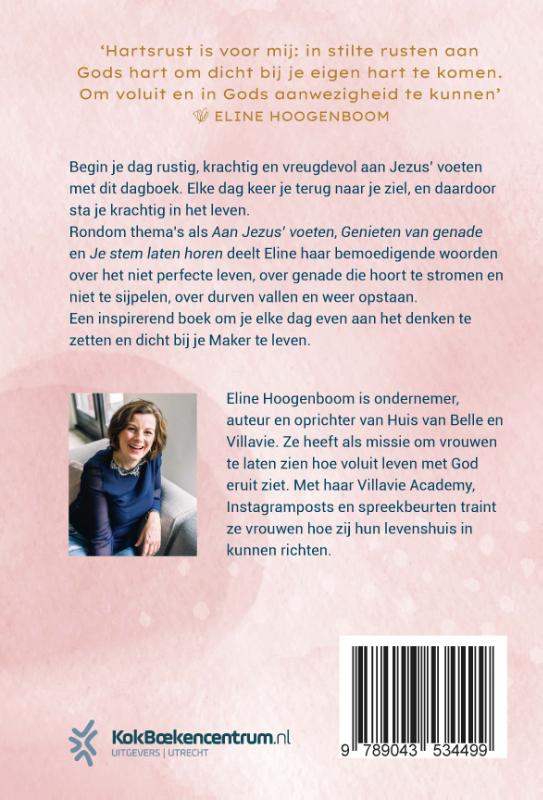 In het dagboek ‘Hartsrust’ biedt Eline Hoogenboom voor elke dag een moment van rust en inspiratie om je dag rustig, krachtig en vreugdevol te beginnen aan Jezus’ voeten. Zo keer je terug naar je ziel, en sta je krachtig in het leven. Met 12 maandthema’s als ‘Aan Jezus’ voeten’, ‘Laat genade stromen’, ‘Je imperfecte leven’ en ‘Thuiskomen bij jezelf’, deelt Eline Hoogenboom haar bemoedigende woorden over het niet perfecte leven, over genade die hoort te stromen en niet te sijpelen, over durven vallen en weer opstaan.