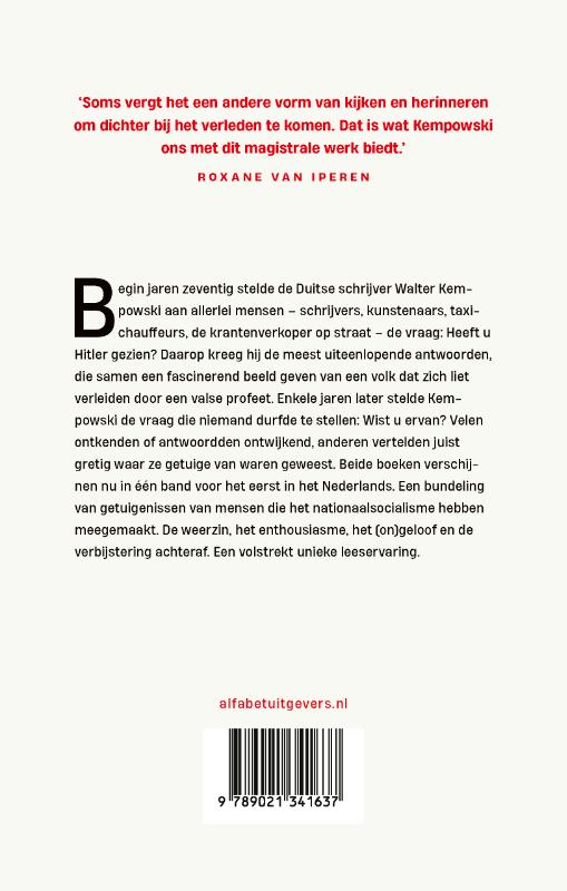 Begin jaren zeventig stelde de Duitse schrijver Walter Kempowski aan allerlei mensen – schrijvers, kunstenaars, taxichauffeurs, de krantenverkoper op straat – de vraag: Heeft u Hitler gezien? Daarop kreeg hij de meest uiteenlopende antwoorden, die samen een fascinerend beeld geven van een volk dat zich liet verleiden door een valse profeet. Enkele jaren later stelde Kempowski de vraag die niemand durfde te stellen: Wist u ervan? Velen ontkenden of antwoordden ontwijkend, anderen vertelden juist gretig waar ze getuige van waren geweest.