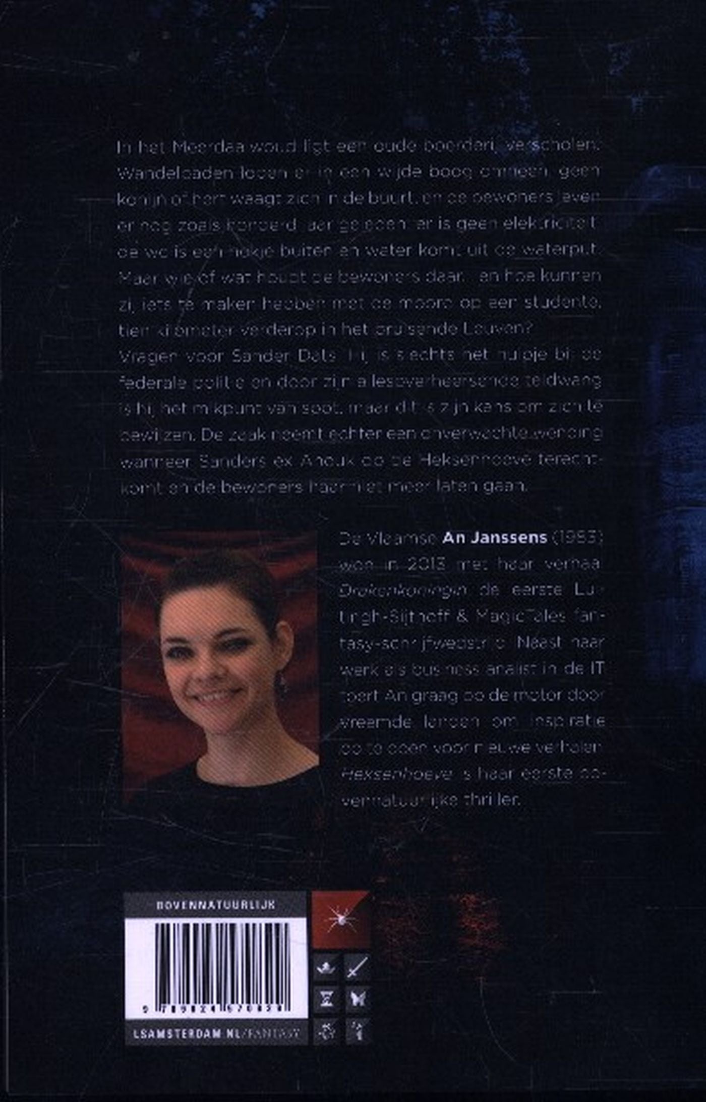 De Vlaamse An Janssens (1983) won in 2013 met haar verhaal Drakenkoningin de eerste Luitingh-Sijthoff & MagicTales fantasy-schrijfwedstrijd. Naast haar werk als business analist in de IT toert An graag op de motor door vreemde landen om inspiratie op te doen voor nieuwe verhalen. Heksenhoeve is haar eerste bovennatuurlijke thriller.