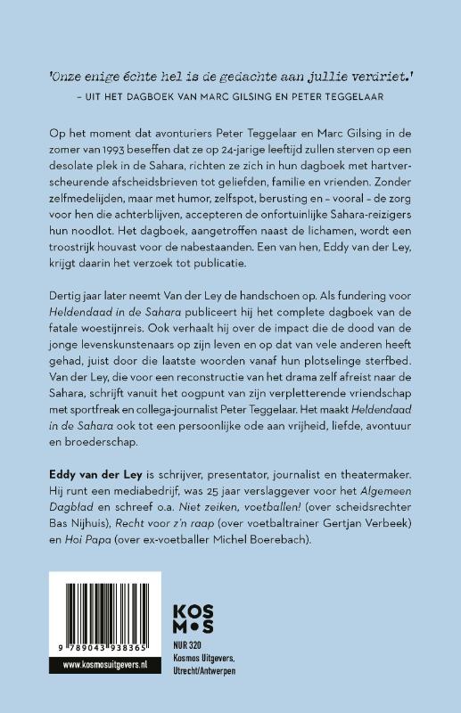 ‘Onze enige hel is de gedachte aan jullie verdriet.’ Op het moment dat avonturiers Peter Teggelaar en Marc Gilsing in de zomer van 1993 beseffen dat ze zullen sterven op een desolate plek in de Sahara, richten ze zich in hun dagboek met hartverscheurende afscheidsbrieven tot familie en vrienden. Het dagboek dat wordt aangetroffen naast de lichamen wordt een troostrijk houvast voor de nabestaanden, onder wie Eddy van der Ley. Aan de hand van het dagboek publiceert Van der Ley over de fatale woestijnreis.