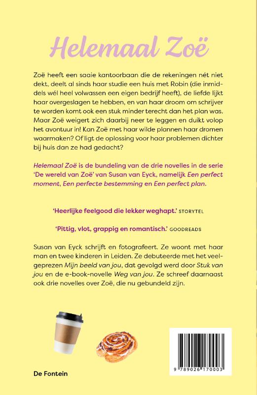 Helemaal Zoë is de bundeling van de drie novelles in de ‘De wereld van Zoë’-serie van Susan van Eyck (1. Een perfect moment; 2. Een perfecte bestemming; 3. Een perfect plan).