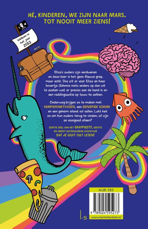 De tienjarige Eliza en haar kleine, geniale broertje zijn helemaal alleen. Hun ouders zijn naar Mars vertrokken en dit keer is het geen flauwe grap van hun vader. De kinderen zetten een reddingsactie op touw en krijgen onderweg te maken met vampierinktvissen, een geniepige schurk en een geheim eiland vol vallen. Lukt het ze om hun ouders terug te vinden, of zijn ze voorgoed aan hun lot overgeleverd?