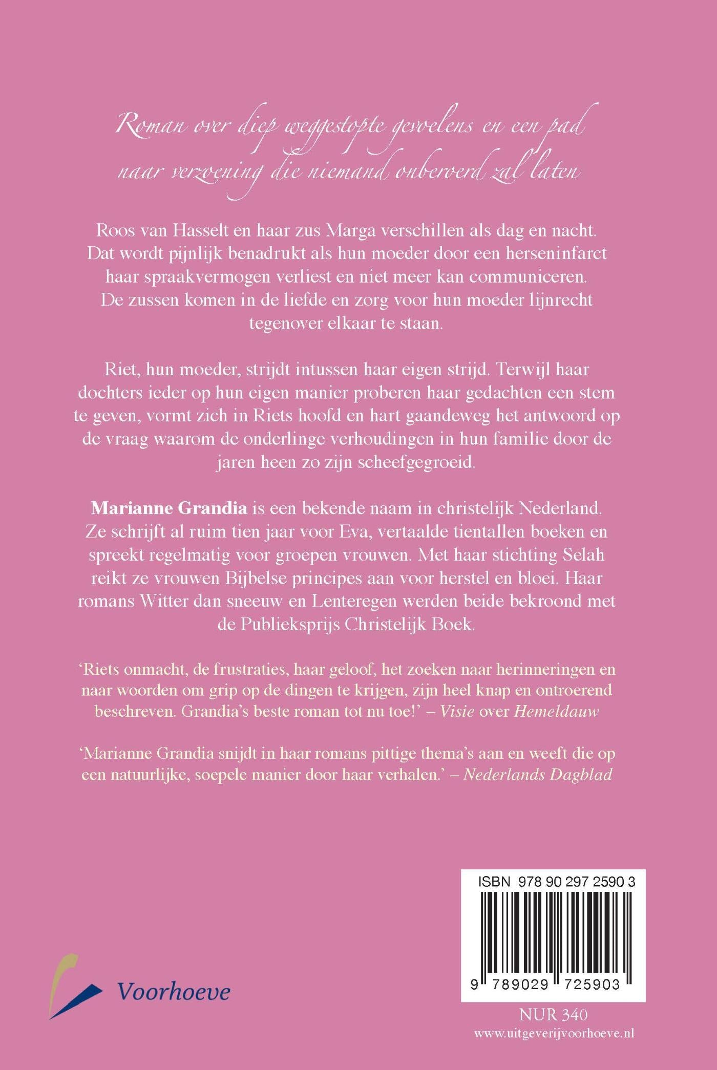 Hemeldauw is de derde roman van Marianne Grandia. Eerder verschenen van haar Witter dan sneeuw en Lenteregen, die beide keren werden bekroond met de Publieksprijs Christelijk Boek. Met Hemeldauw zet Marianne opnieuw een prachtig en ontroerend verhaal neer.