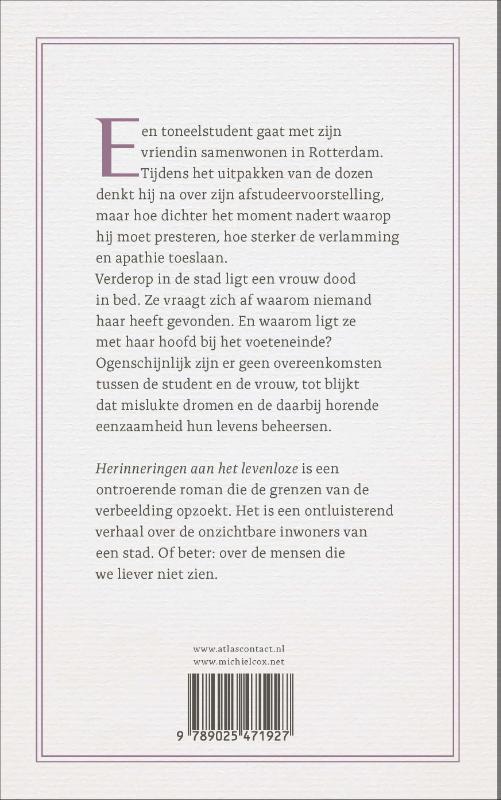 In ‘Herinneringen aan het levenloze’ schetst Michiel Cox het verhaal van een toneelstudent die met zijn vriendin gaat samenwonen in Rotterdam. Tijdens het uitpakken van de dozen denkt hij na over zijn afstudeervoorstelling, maar hoe dichter het moment nadert waarop hij moet presteren, hoe sterker de verlamming en apathie toeslaan.