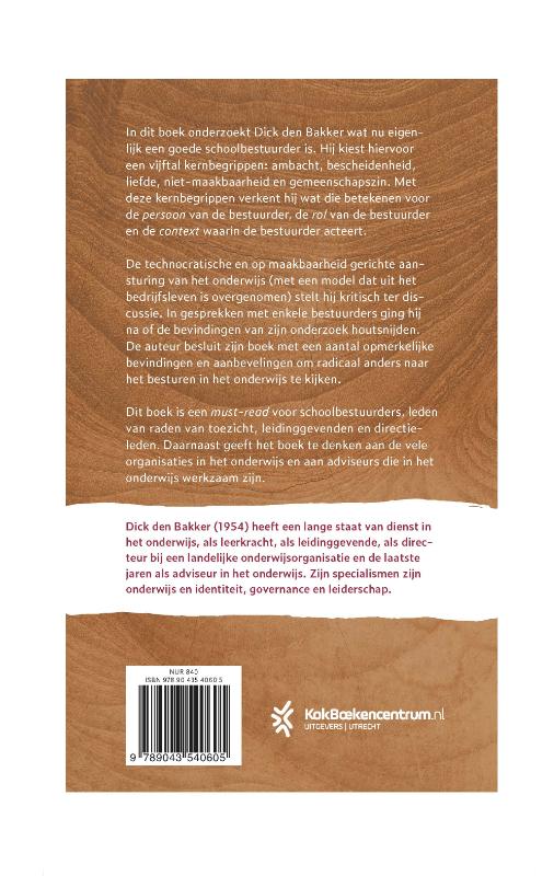 In Het ambacht van een schoolbestuurder onderzoekt Dick den Bakker wat een goede schoolbestuurder is. Hiervoor deed Dick den Bakker uitgebreid literatuuronderzoek en interviewde hij een groot aantal bestuurders. Hij komt tot de conclusie dat een goed bestuurder bescheiden is in wat hij of zij kan bereiken, liefdevol handelt en beseft dat de wereld én het onderwijs niet maakbaar zijn. De auteur onderstreept het belang van gemeenschapszin en de proactieve rol van de bestuurder in het zoeken naar het goede handelen in allerlei situaties. Een inspirerend boek dat aansluit bij de dagelijkse praktijk van het schoolbestuur.