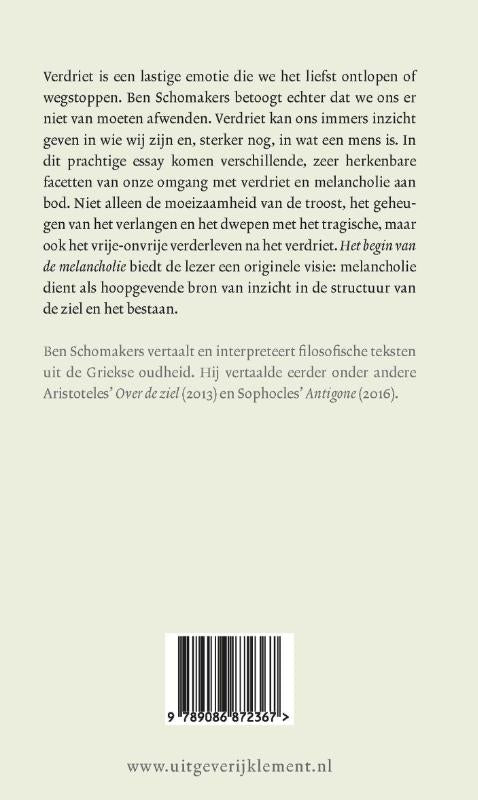 In Het begin van de melancholie betoogt Ben Schomakers dat we ons hoofd niet moeten afwenden van ons verdriet. Immers, verdriet kan ons inzicht geven in wie wij zijn, maar ook in wat een mens is. In dit prachtige essay komen verschillende, zeer herkenbare facetten van onze omgang met verdriet en melancholie aan bod: de moeizaamheid van de troost, het geheugen van het verlangen, het dwepen met het tragische en het vrije-onvrije verder leven na het verdriet. Een originele kijk op melancholie als hoopgevende bron van inzicht in de structuur van de ziel en het bestaan.