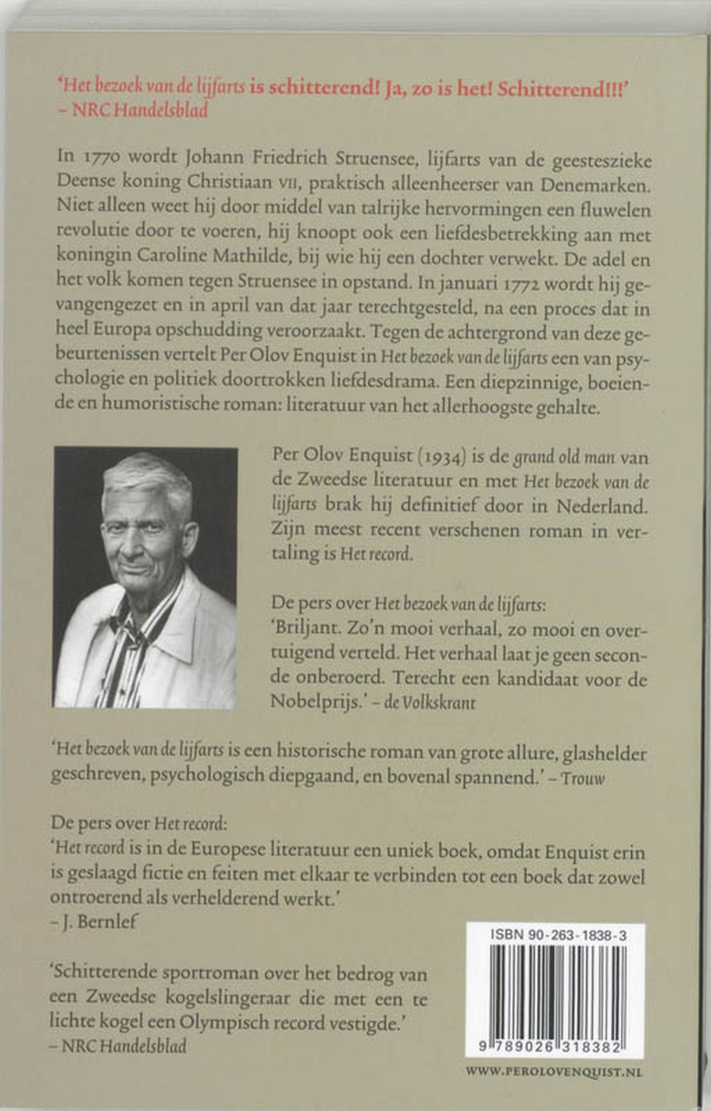 Tegen de achtergrond van deze gebeurtenissen en van de naderende confrontatie tussen het absolutisme en de Verlichting in Europa vertelt Per Olov Enquist in Het bezoek van de lijfarts een van psychologie en politiek doortrokken liefdesdrama. De beschrijvingen van de waanvoorstellingen van Christian VII vormen het leidmotief van Enquists vertelling en schetsen een aandoenlijk, poëtisch beeld van de waanzinnige koning. Caroline Mathilde, de zuster van de Engelse koning, trouwt op vijftienjarige leeftijd met Christian, maar wordt vervolgens geheel genegeerd en leidt een geïsoleerd leven aan het verre Deense hof. Stuensee, de verlichte intellectueel, is hun verlosser, die deze tragische figuren hun menselijke waardigheid teruggeeft.