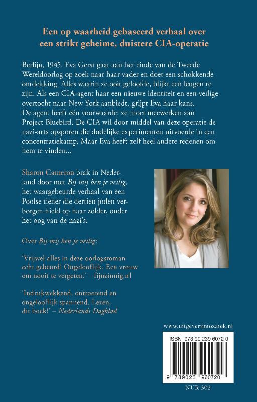 Het Bluebird geheim van Sharon Cameron is een beklemmende pageturner over Project Bluebird, dat echt bestaan heeft. Met dit project probeerde de CIA, door gebruik te maken van technieken die in de concentratiekampen waren ontwikkeld, het geheugen van mensen te resetten.