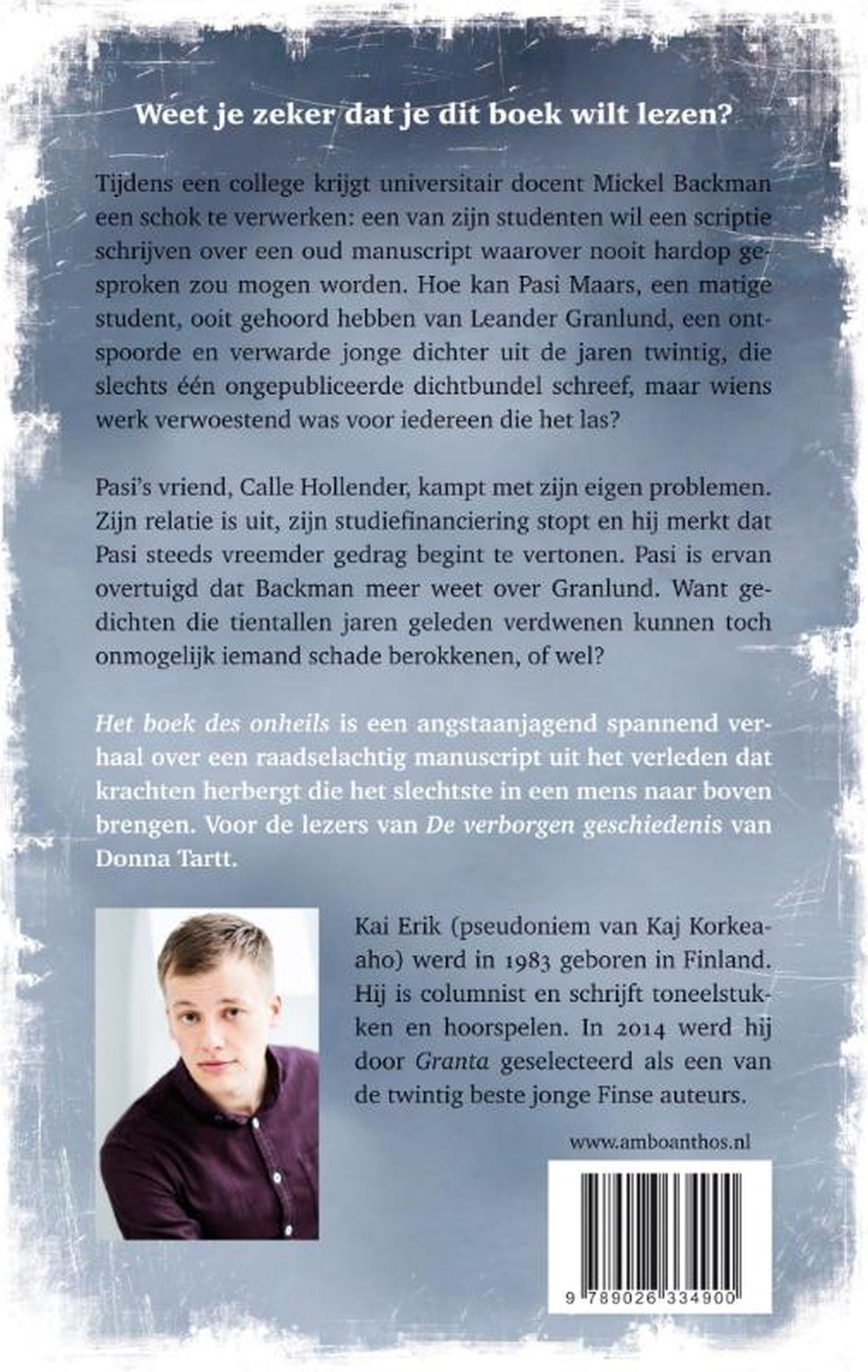 ‘Het boek des onheils’ van Kai Erik is voor lezers van ‘De verborgen geschiedenis’ van Donna Tartt en ‘Zwart krijt’ van Christopher Yates: een angstaanjagend spannend verhaal over een raadselachtig manuscript uit het verleden dat krachten herbergt die het slechtste in een mens naar boven halen. Afgunst, destructieve trots en een verpletterend gevoel van de zinloosheid van het bestaan… Weet je zeker dat je ‘Het boek des onheils’ wilt lezen? Kai Erik (zijn echte naam is Kaj Korkea-aho) werd in 1983 geboren in Finland. Hij is columnist en schrijft toneelstukken en hoorspelen. In 2014 werd hij door Granta geselecteerd als een van de 20 beste jonge Finse auteurs.