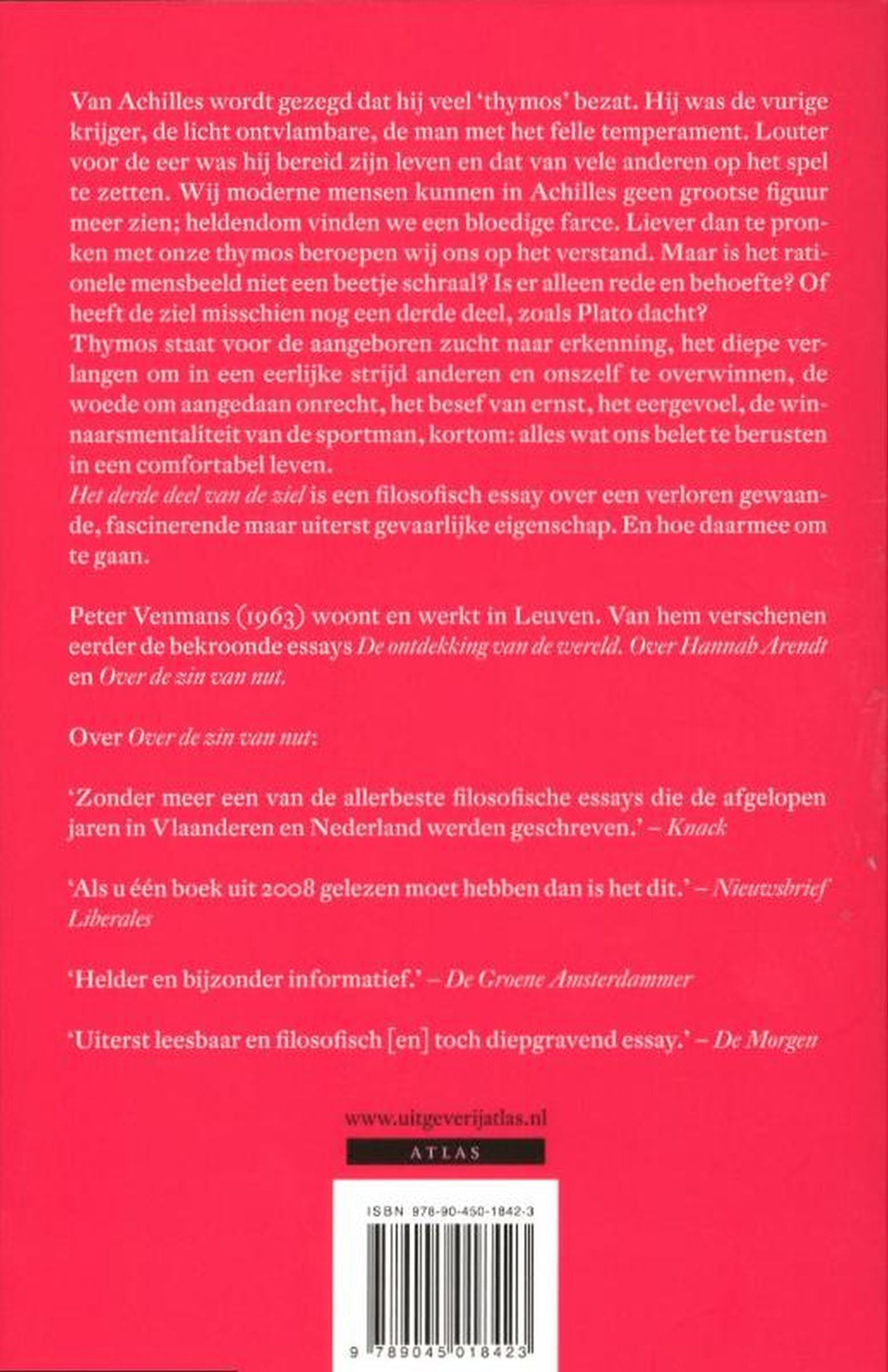 Thymos staat voor de aangeboren zucht naar erkenning, het diepe verlangen om in een eerlijke strijd anderen en onszelf te overwinnen, de woede om aangedaan onrecht, het besef van ernst, het eergevoel, de winnaarsmentaliteit van de sportman, kortom, alles wat ons belet te berusten in een comfortabel leven. Het derde deel van de ziel is een filosofisch essay over een verloren gewaande, fascinerende maar uiterst gevaarlijke eigenschap. En hoe daarmee om te gaan.