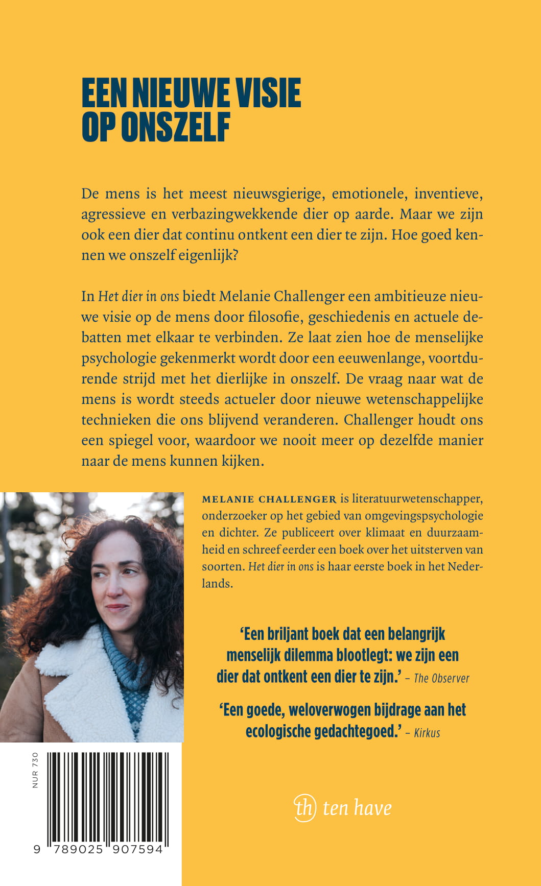 In 'Het dier in ons' biedt Melanie Challenger een ambitieuze nieuwe visie op de mens door filosofie, geschiedenis en actuele debatten met elkaar te verbinden. Ze laat zien hoe de menselijke psychologie gekenmerkt wordt door een eeuwenlange, voortdurende strijd met het dierlijke in onszelf. De vraag naar wat de mens is wordt steeds actueler door nieuwe wetenschappelijke technieken die ons blijvend veranderen. Challenger houdt ons een spiegel voor, waardoor we nooit meer op dezelfde manier naar de mens kunnen kijken.