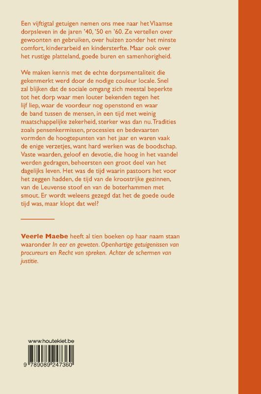 Een vijftigtal getuigen nemen ons mee naar het Vlaamse dorpsleven in de jaren ’40, ’50 en ’60. Ze vertellen over gewoonten en gebruiken, over huizen zonder het minste comfort, kinderarbeid en kindersterfte. Maar ook over het rustige platteland, goede buren en samenhorigheid.