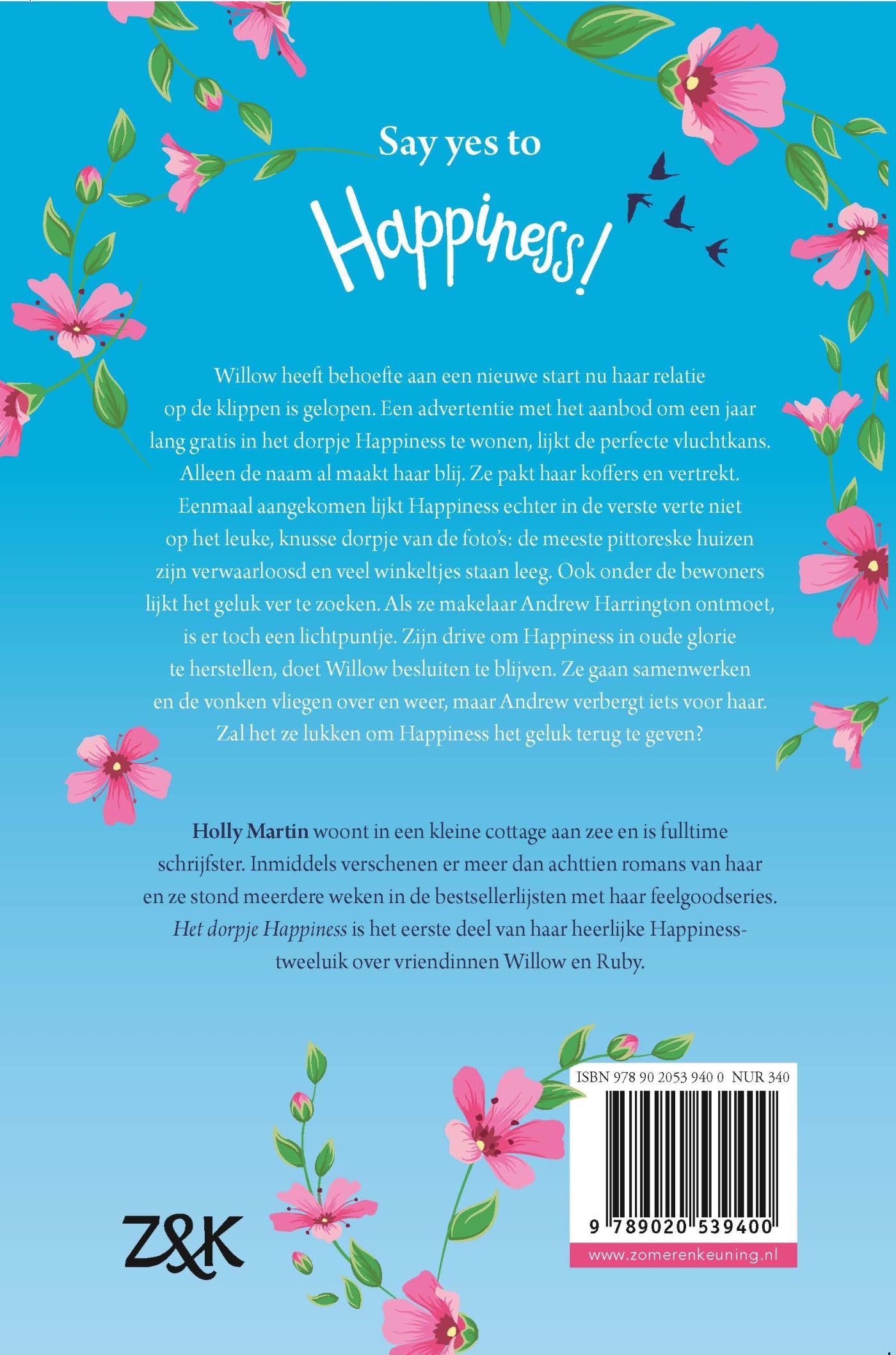 Willow, de hoofdpersoon in 'Het dorpje Happiness' van Holly Martin, heeft behoefte aan een nieuwe start. Haar relatie is net voorbij en iedereen in het dorpje waar ze woont, heeft er een mening over. Als Willow een advertentie ziet om een jaar lang gratis in het dorpje Happiness te wonen, lijkt het een droom. Ze pakt haar koffers en vertrekt. De droom blijkt te mooi om waar te zijn: het dorpje is lang niet zo lieflijk als op de foto’s en de meeste pittoreske pandjes bevinden zich in erbarmelijke staat. Maar Willow geeft niet zomaar op en gelukkig staat ze er niet alleen voor.